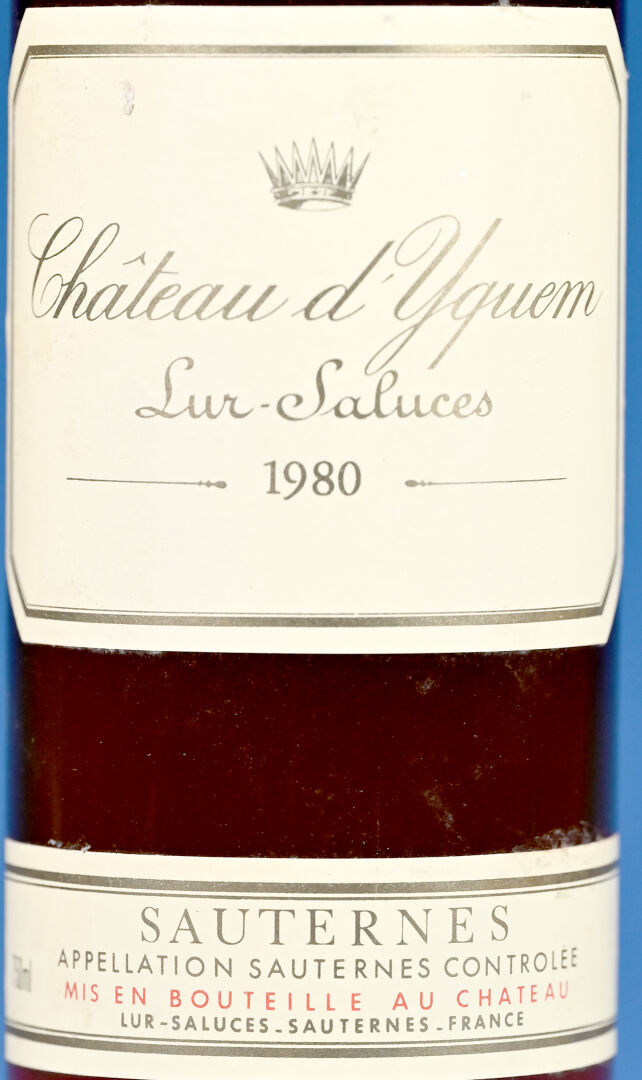1 bouteille, Sauternes, Château d’Yquem, 1er Grand Cru Classé Supérieur, 1980. TLB (+). Quelques très légères traces sur l’étiquette.
