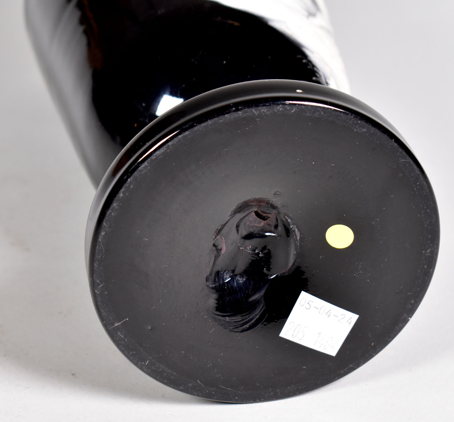 Attribué à Mary GREGORY. Vase en verre noir, le col à corole à décor émaillé blanc d’un lutin. Haut. : 29 cm.