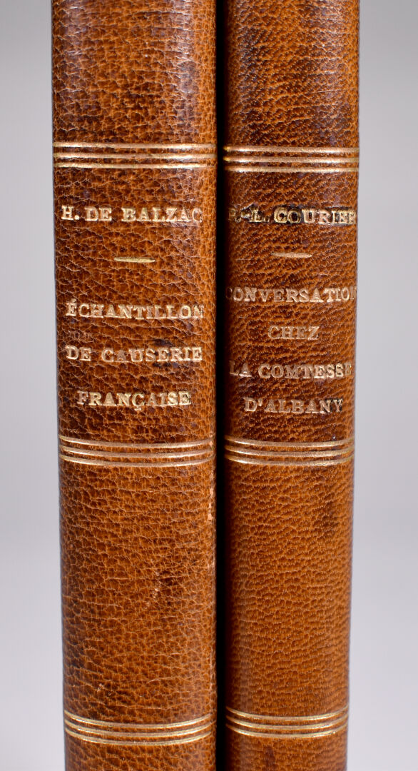 BALZAC (H. de). ÉCHANTILLON DE CAUSERIE FRANÇAISE – COURIER (P.-L.). CONVERSATION CHEZ LA COMTESSE D’ALBANY. P., Plon, 1928. Deux volumes in-8 ½ maroquin vert bronze à grain long, dos lisse cloisonné, tête dorée, couverture conservée (Reliure de l’époque). Dos uniformément passés en teinte havane. ÉDITION de la collection Conversations. Un des 950 Arches. Exemplaires bien reliés. ENSEMBLE DE 2 OUVRAGES.