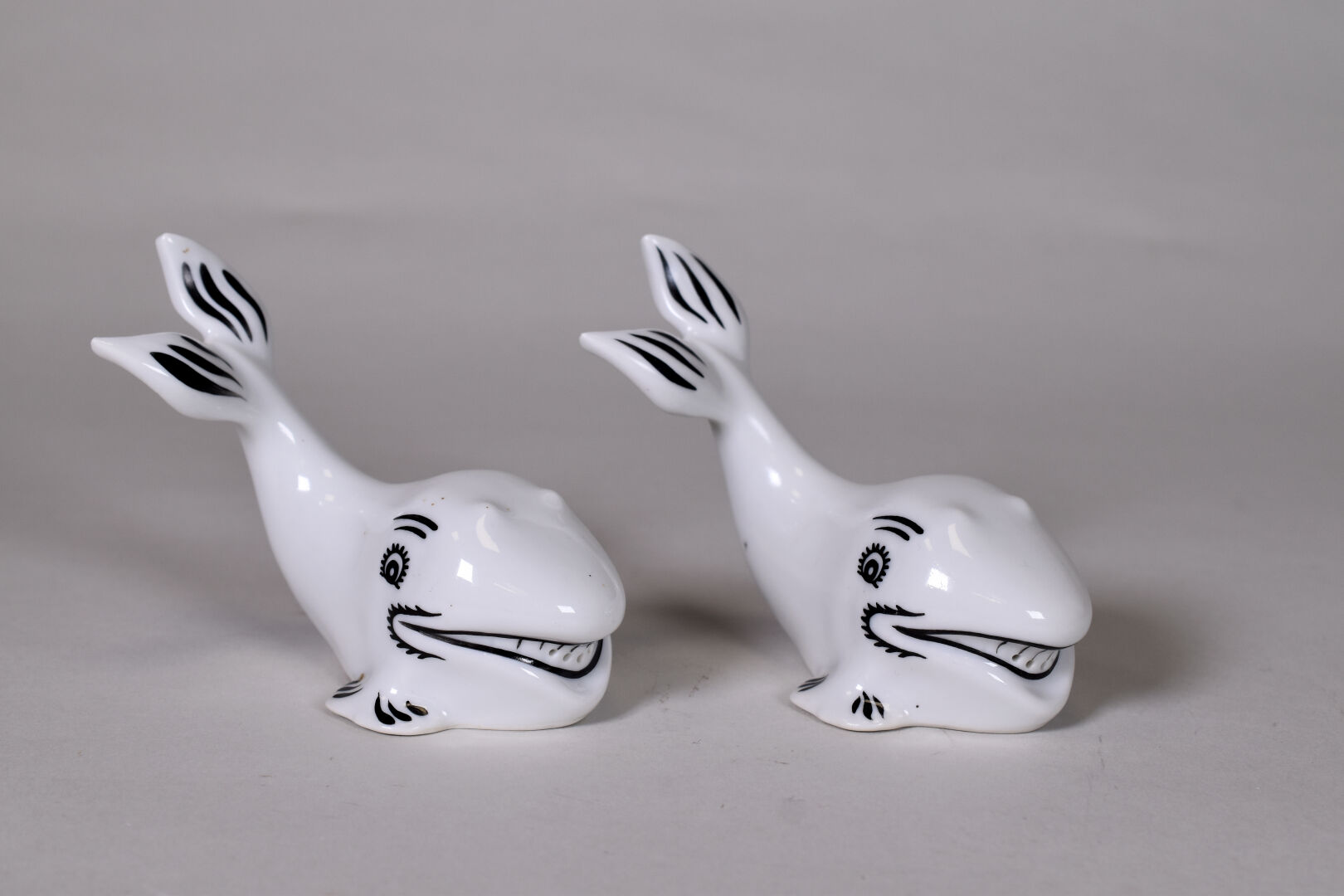 Benjamin RABIER (1864-1939). Deux salières publicitaires en porcelaine en forme de baleine. Signées. Haut. : 9 cm.