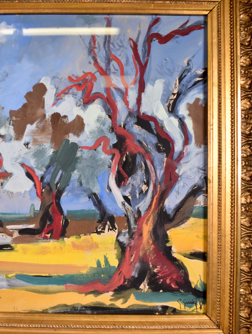 Ecole Fauve, G. GARCIA (XXe siècle). Les arbres rouges. Gouache signée en bas à droite. 48 x 59 cm (à vue).