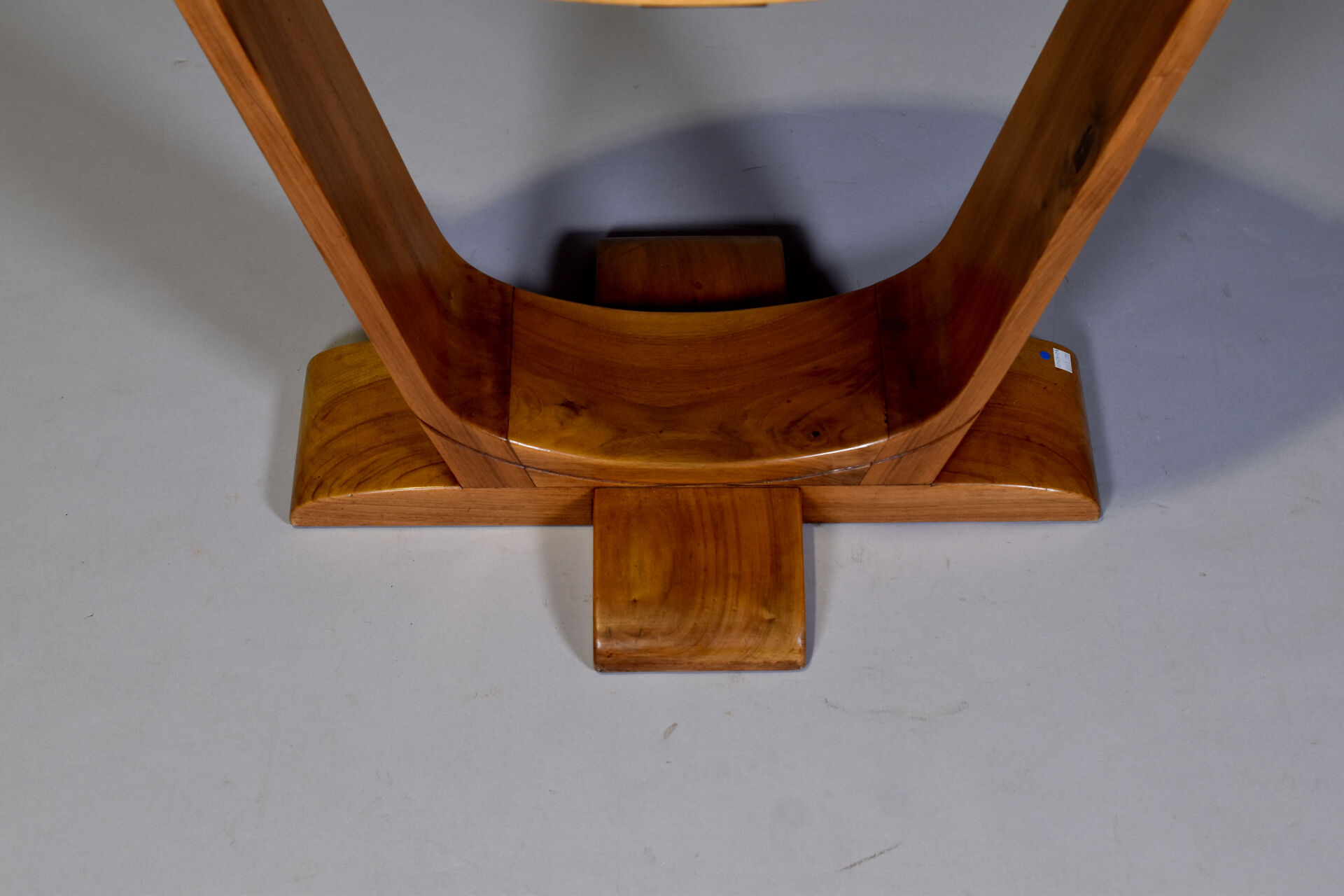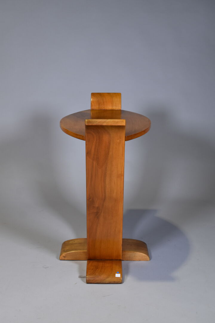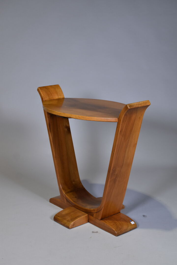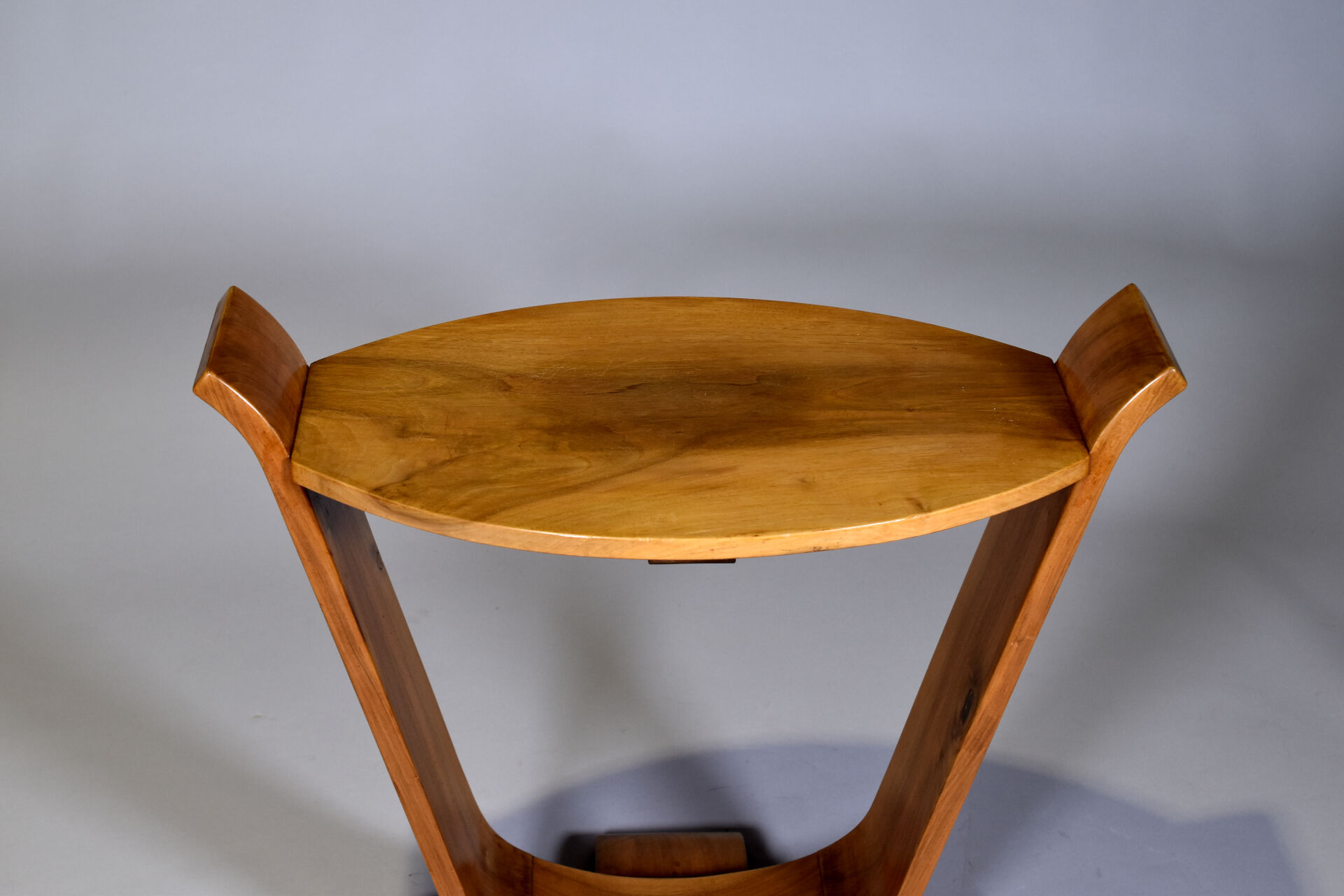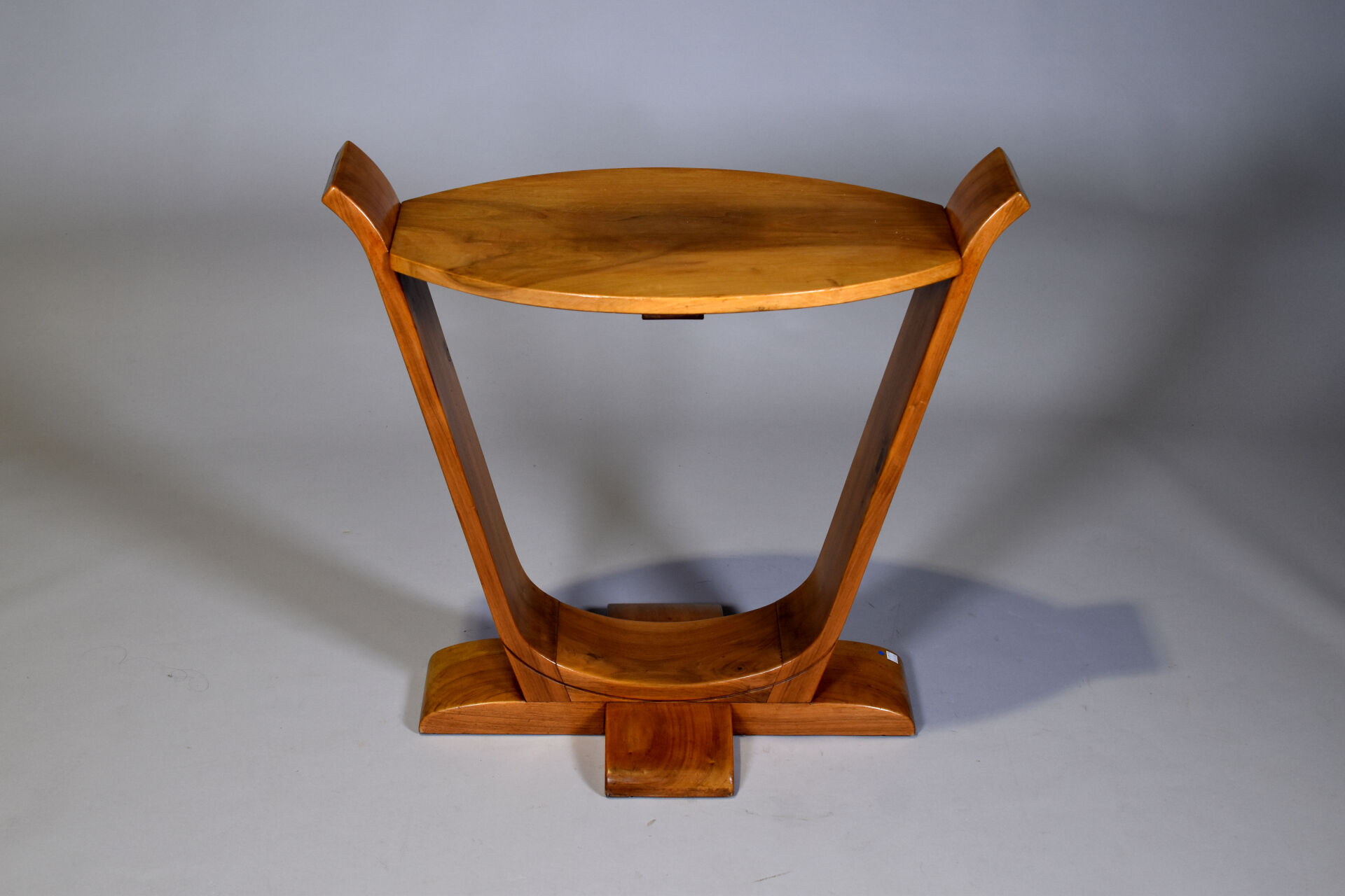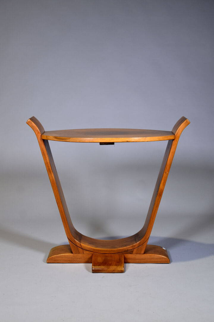 Guéridon en noyer blond sculpté, le pietement de forme lyre. le plateau ovale. Epoque Art déco. Haut. : 73 cm – Larg. : 79 cm – Prof. : 42 cm.