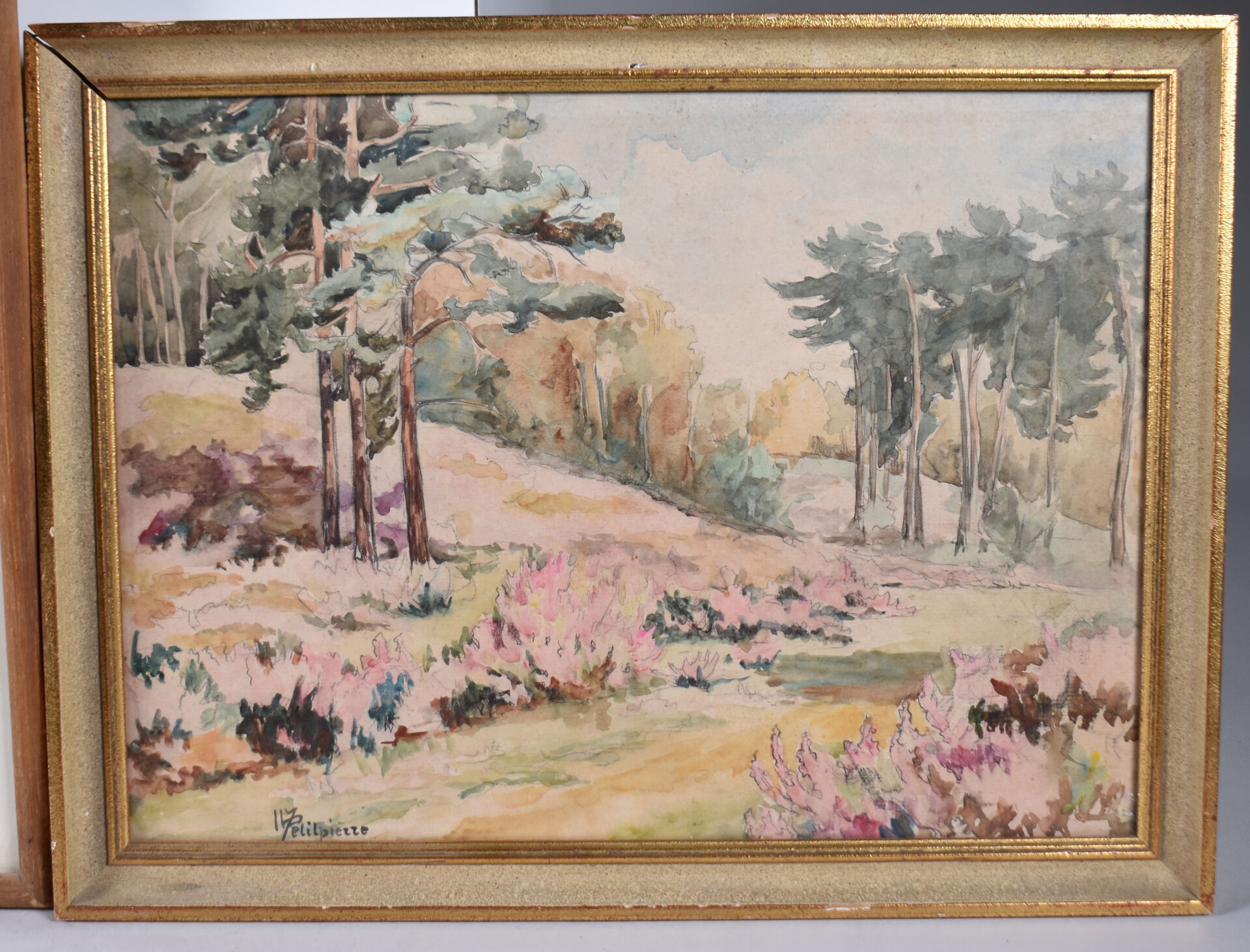 J. BONNEIL (XXe siècle). Vue de village catalan ? Aquarelle signée en bas à droite et située en bas à gauche. 49 x 30 cm (à vue). On joint. : PETITPIERRE ? Pins et bruyère. Aquarelle signée en bas à gauche. 24 x 33 cm (à vue).