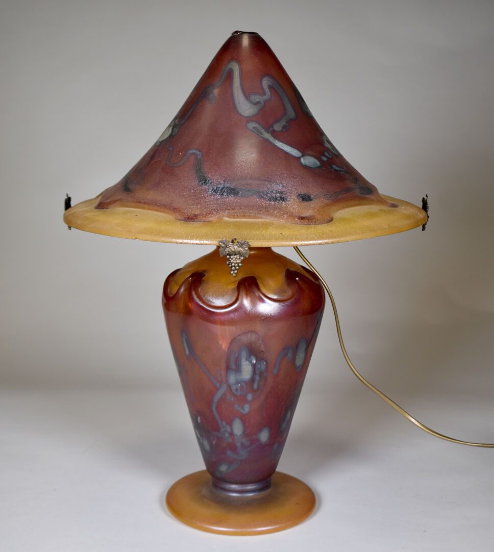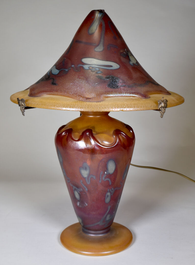 Lampe champignon en verre orange, bleu et jaune (éclats). Monture en métal à décors de grappes de raisins. Dans le goût de Biot, XXe siècle. Haut. : 54 cm.