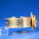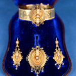Parure en or jaune 18K 750/1000e comprenant un jonc articulé ouvrant à décor d’un médaillon central serti de demi-perles (dim. internes : 5 x 5,5 cm), une broche du même modèle (haut. : 5 cm) et une paire de pendants d’oreilles du même modèle. Long. des boucles : 5 cm. Dans leur écrin à la forme signé H.ANCELY Joaillerie Toulouse. Seconde moitié du XIXème siècle. Poids brut total. : 49 g.