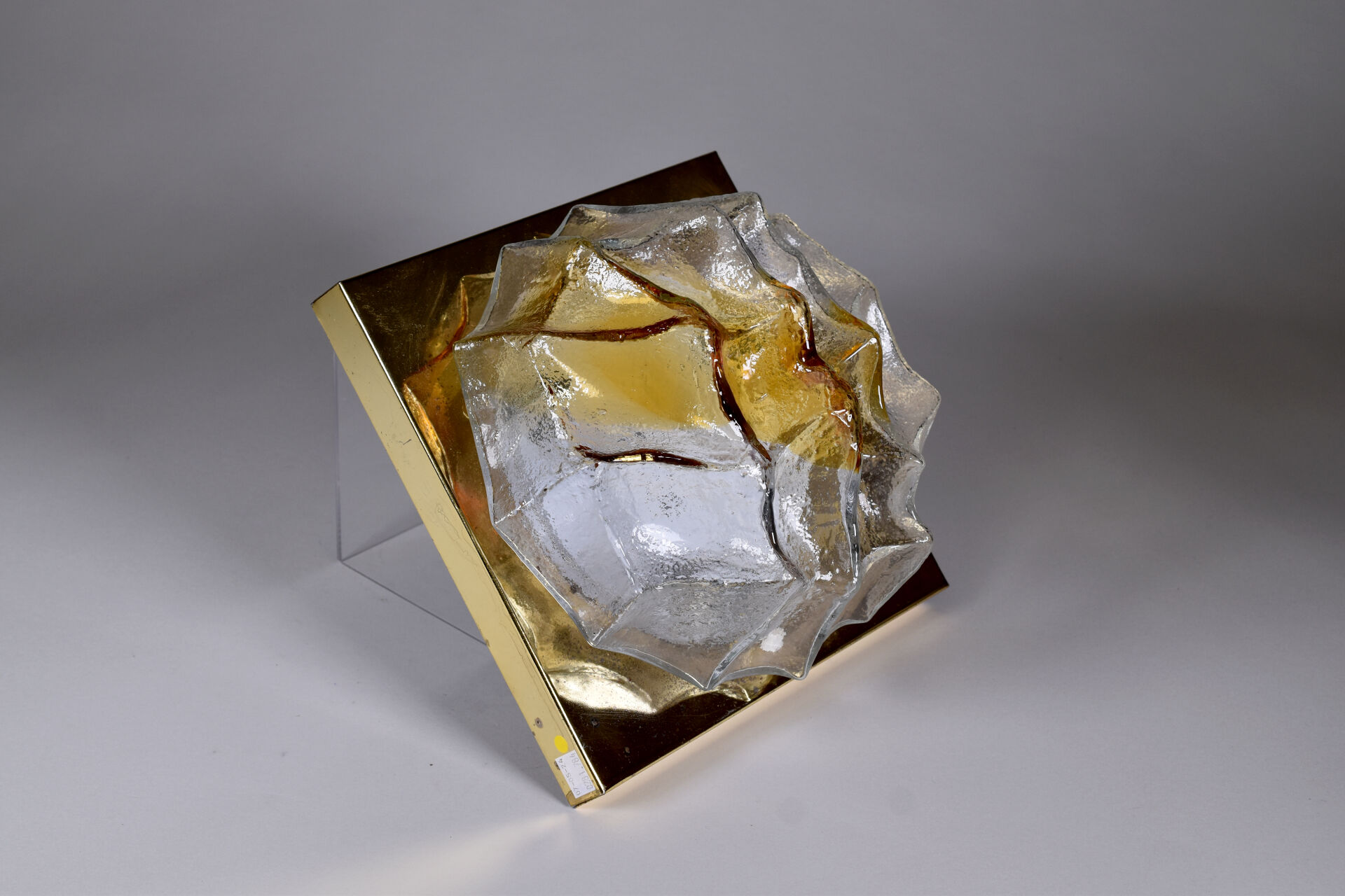 Plafonnier en verre clair dépoli et ambré de forme mouvementé. La base en laiton. Vers 1970. Haut; : 15 cm.