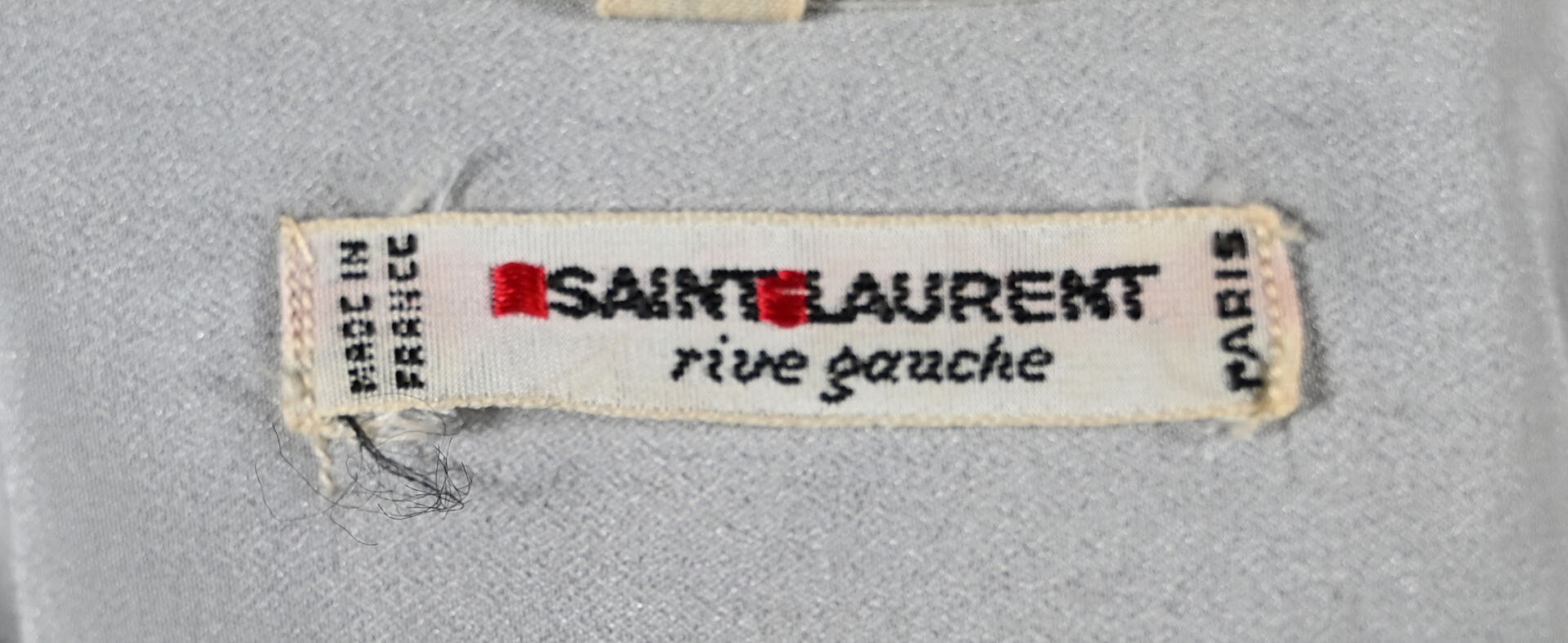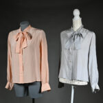 YVES SAINT-LAURENT Rive gauche. Deux chemisiers en soie, le col à lavallière , un rose poudré et l’autre bleu ciel (petit accro sur le bleu, taches et piqures sur les deux). Taille 42.