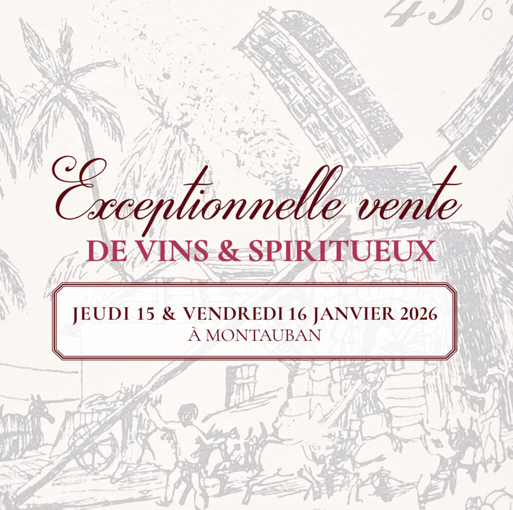 Première partie : vente vins & spiritueux Janvier 2026 15 JAN 10h00 8 Place Marcel Lenoir, 82000 MONTAUBAN Voir la vente Première partie : vente vins & spiritueux Janvier 2026 Première partie de l’exceptionnelle vente de vins & spiritueux de Janvier 2026 ... 15/01/2026 - 10:00 8 Place Marcel Lenoir, 82000 MONTAUBAN