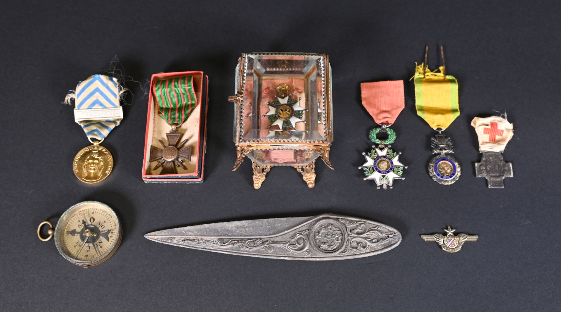 NOS LOTS EN VENTE AUX ENCHÈRES Lot n° 72 Ensemble d’appareils photos argentiques et à soufflet et… Estimation : 40 / 60 € Lot n° 70 Pendulette d’officier en laiton. Cadran à fond crème… Estimation : 40 / 60 € Lot n° 69 Pendule portique en marbre rose et beige. Cadran… Estimation : 60 / 80 € Lot n° 68 FREDERIC VOLLE. Ensemble soit : -« Grenade » – (années… Estimation : 60 / 80 € Lot n° 67 Quatre pochettes du soir en métal doré et… Estimation : 60 / 80 € Lot n° 66 FREDERIC VOLLE – « Fontainebleau » – (années 1990). Ensemble… Estimation : 60 / 80 € Lot n° 65 Lot de décorations diverses françaises, on y trouve… Estimation : 20 / 30 € Lot n° 64 Sabre 1822 de cavalerie légère, issu de l’industrie… Estimation : 40 / 60 € Lot n° 63 Baïonnette réglementaire d’infanterie au fusil Gras. Modèle 1874.… Estimation : 40 / 60 € Page1 Page2 Page3 Page4 Page5