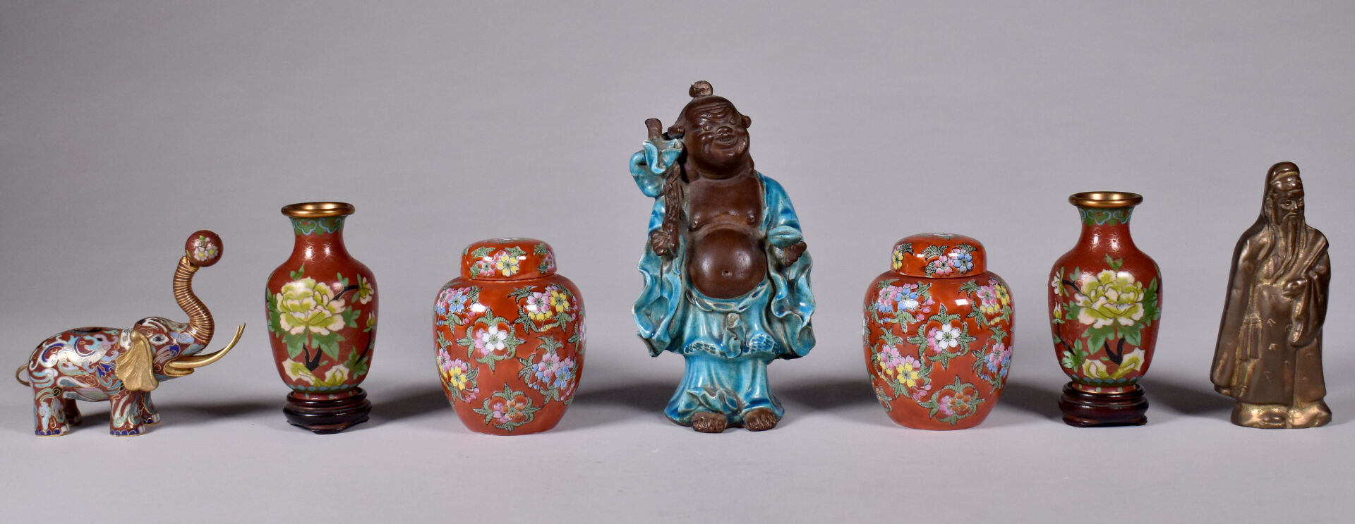 NOS LOTS EN VENTE AUX ENCHÈRES Lot n° 98 Adjugé : 80 € Plat à décor en émaux cloisonnés polychromes et… Estimation : 50 / 60 € Lot n° 97 Adjugé : 30 € Vase balustre à décor en émaux cloisonnés de… Estimation : 20 / 40 € Lot n° 96 Brûle-parfum en bronze, le piètement formé de quatre… Estimation : 50 / 80 € Lot n° 95 Trois petites stèles en bois noirci représentant des… Estimation : 40 / 60 € Lot n° 94 Adjugé : 100 € Sceau en bronze représentant un éléphant. Vietnâm. Haut.… Estimation : 15 / 30 € Lot n° 93 Guanyn en cornaline sculptée (un manque – restauration).… Estimation : 5 / 10 € Lot n° 92 Adjugé : 20 € Tangka sur toile représentant Padma Sambava et Lamas.… Estimation : 20 / 40 € Lot n° 91 Adjugé : 10 € Petit ensemble cit une paire de pots à… Estimation : 20 / 40 € Lot n° 90 Tangka représentant Cakiamuni assis tenant le bol à… Estimation : 60 / 80 € Page1 Page2 Page3 Page4 Page5