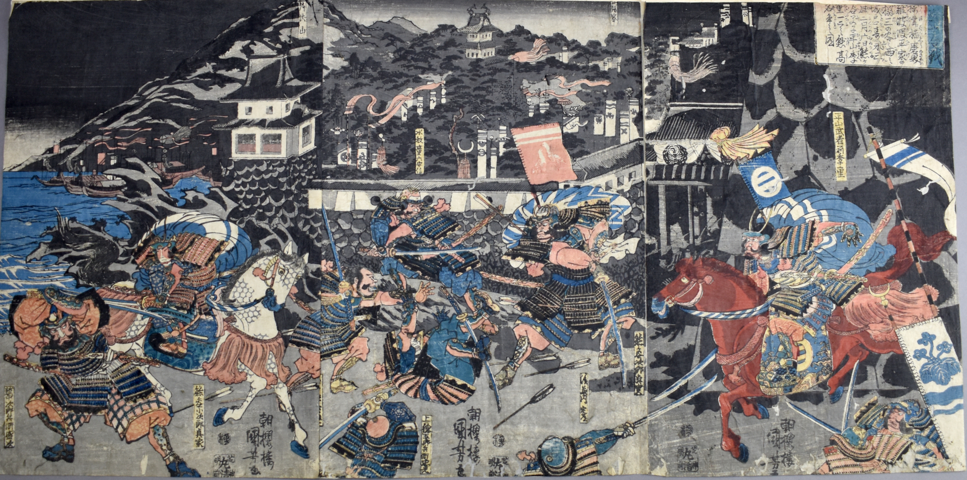 Lot n° 53 Adjugé : 200 € Deux estampes japonaises en couleur, signées Ichiyusai Kuniyoshiga… Estimation : 100 / 150 €