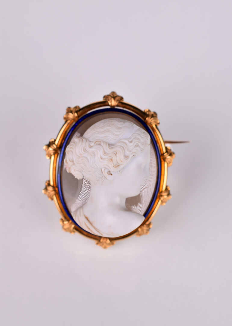 Lot n° 122 Adjugé : 700 € Broche camée agate brun clair figurant un portrait… Estimation : 400 / 600 €