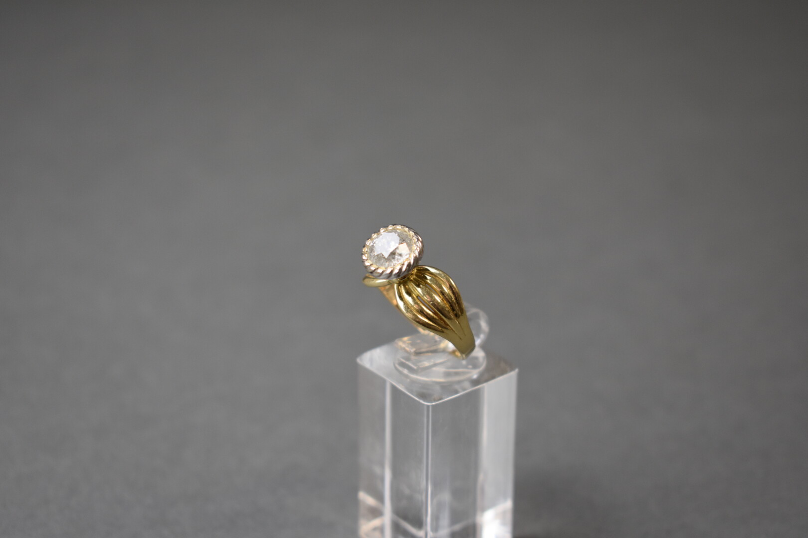 Lot n° 18 Adjugé : 260 € Bague marguerite en or jaune 18K 750/1000e, le centre… Estimation : 180 / 220 €