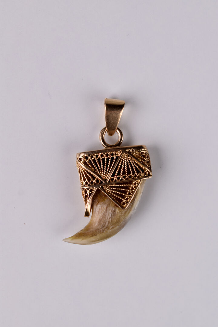 Lot n° 140 Adjugé : 125 € Pendentif griffe avec partie en or 750/1000e. Haut.… Estimation : 50 / 80 €