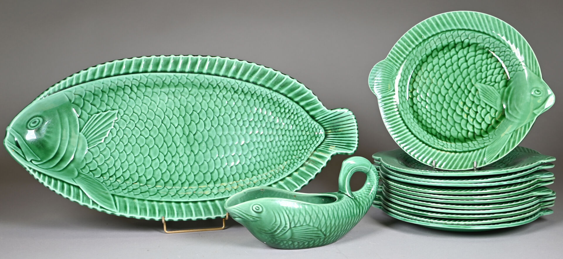 Lot n° 207 Adjugé : 220 € SARREGUEMINES. Service à poisson en faïence émaillée verte… Estimation : 30 / 60 €