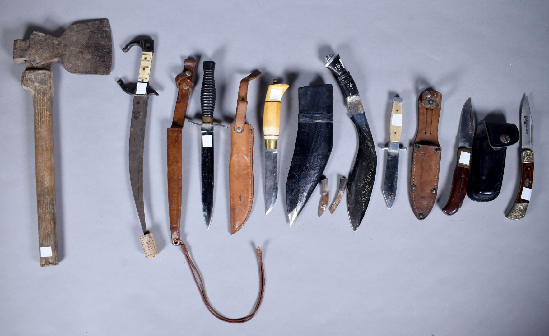 NOS LOTS EN VENTE AUX ENCHÈRES Lot n° 101 Lot de 8 armes blanches dont une hache… Estimation : 30 / 40 € Lot n° 99 Ensemble de deux cartonniers contenant des documents anciens,… Estimation : 80 / 120 € Lot n° 98 Trois cannes de poilu, une à tête de… Estimation : 100 / 150 € Lot n° 95 Insigne de membre de l’Assemblée nationale modèle IIIe République.… Estimation : 60 / 80 € Lot n° 94 Un carton de manuel technique après guerre sur… Estimation : 20 / 30 € Lot n° 93 Ensemble de 24 paquets de cigarettes et tabac… Estimation : 50 / 80 € Lot n° 92 Ensemble d’armes blanches principalement d’Afrique du nord avec… Estimation : 60 / 80 € Lot n° 91 Poignard algérien en bronze argenté avec le manche… Estimation : 60 / 80 € Lot n° 90 Coque de casque US, version à pattes mobile… Estimation : 40 / 60 € Page1 Page2 Page3 Page4 Page5