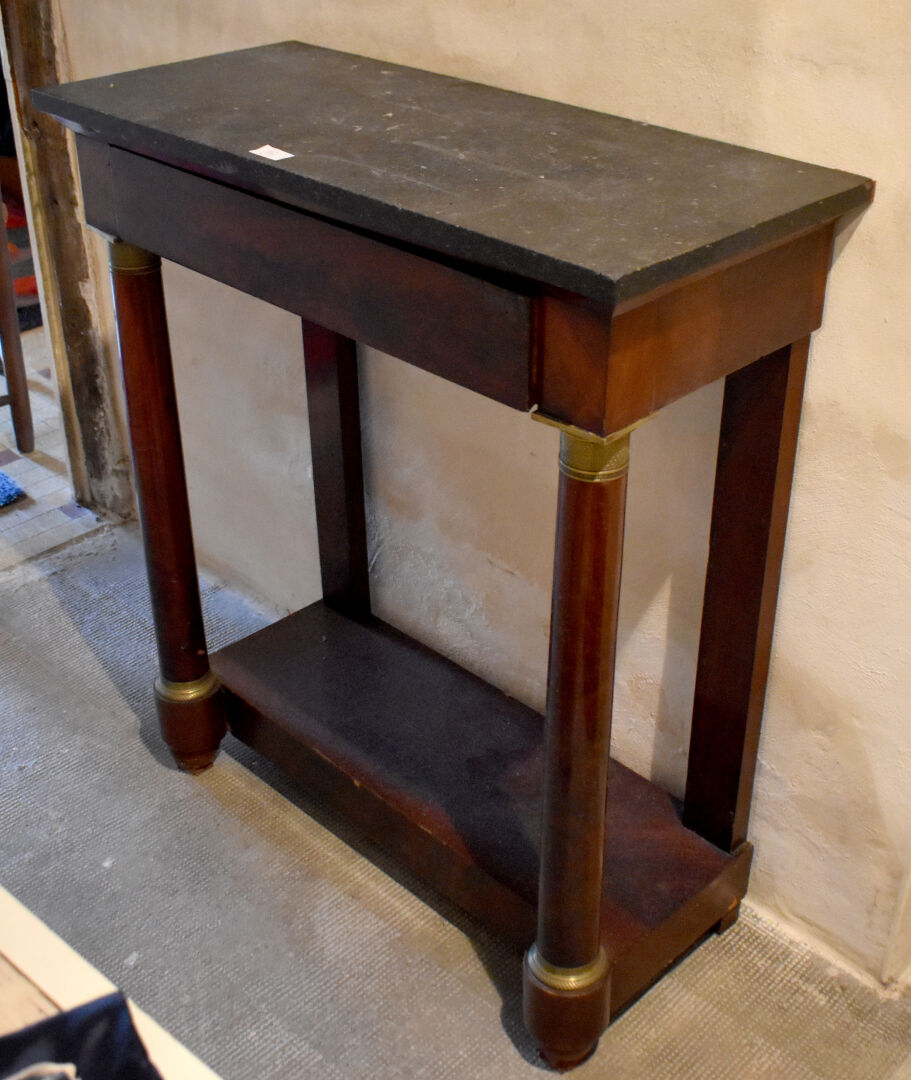 Lot n° 130 Adjugé : 120 € Console en acajou et placage d’acajou (éclats). Elle… Estimation : 80 / 120 €