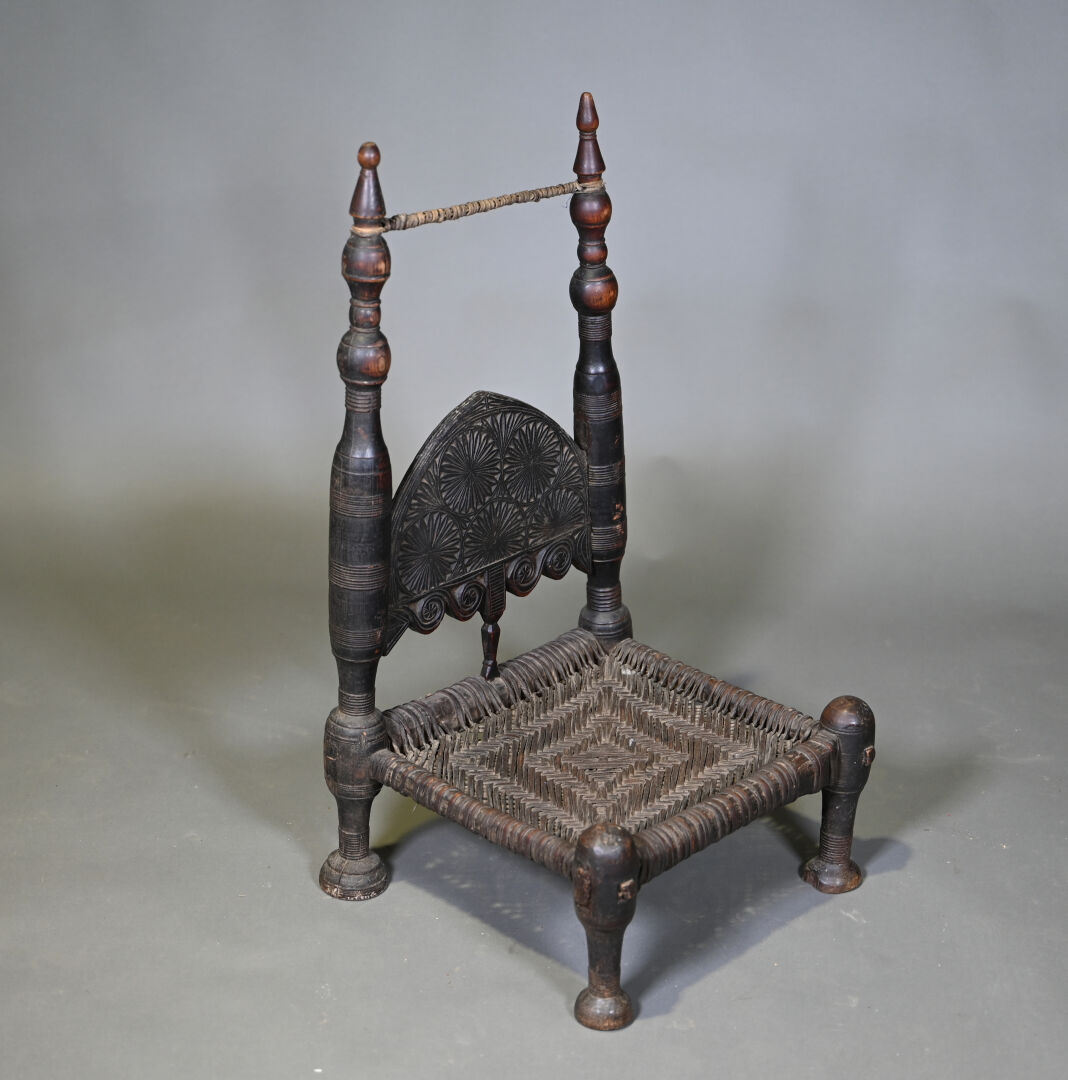 Lot n° 189,1 Adjugé : 100 € Chaise basse en cèdre, région du Nouristan, Afghanistan.… Estimation : 50 / 80 €