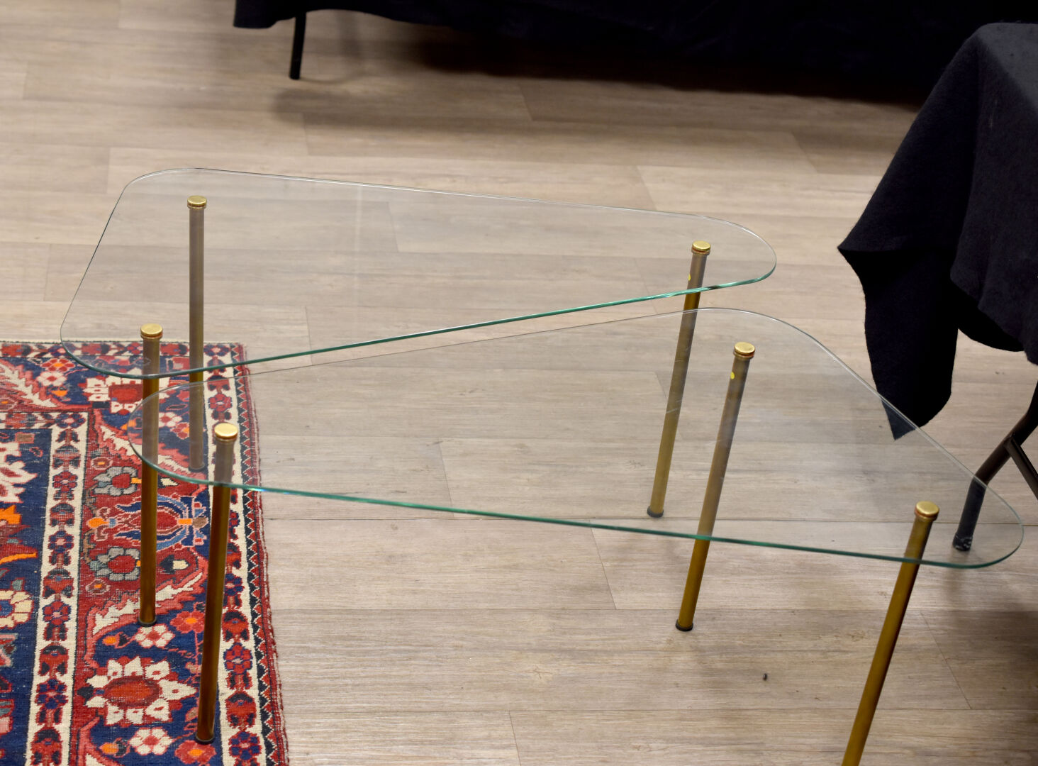 Lot n° 204 Adjugé : 40 € Deux tables basses formant pendant, les plateaux triangulaires… Estimation : 40 / 80 €