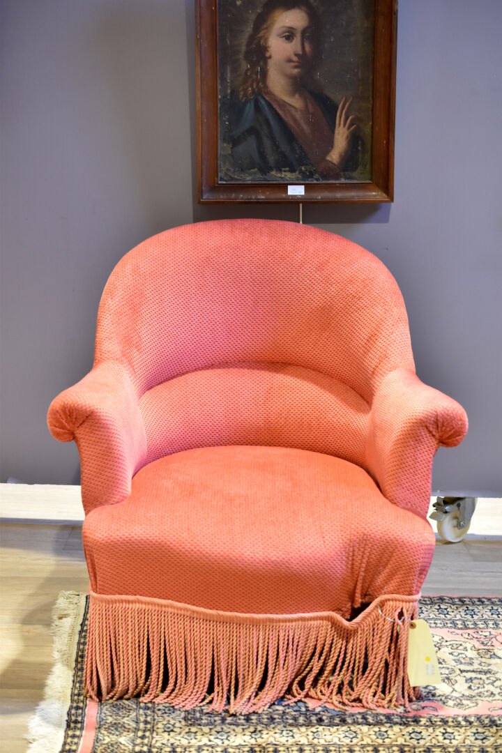 Lot n° 216 Adjugé : 30 € Fauteuil crapaud garnis de velours rose frangé. Époque… Estimation : 40 / 60 €