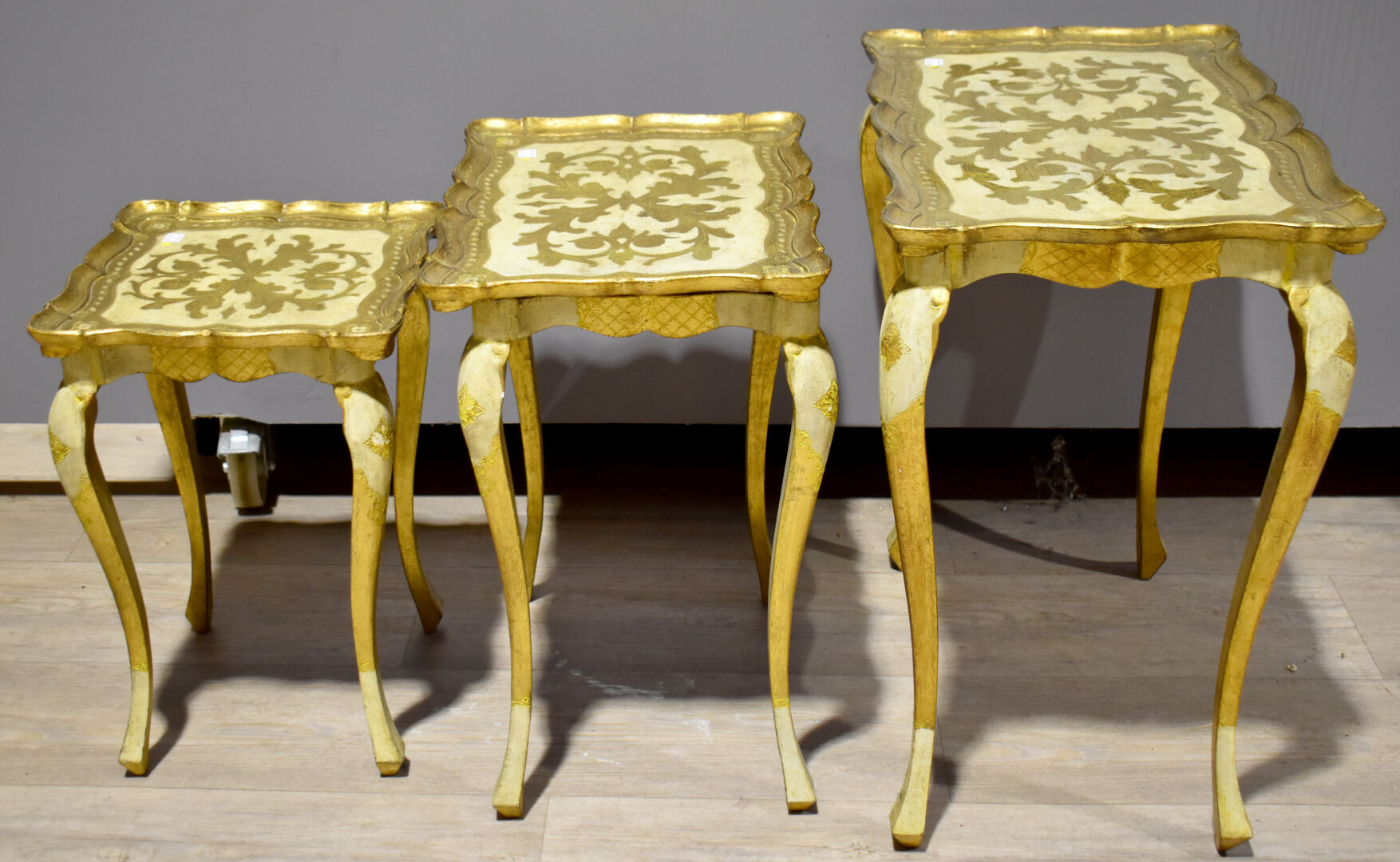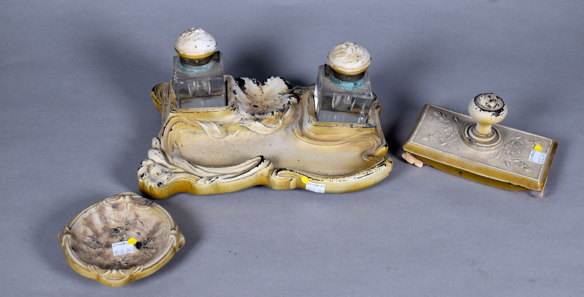 NOS LOTS EN VENTE AUX ENCHÈRES Lot n° 189 ARLUS. Suite de 3 appliques en métal laqué… Estimation : 80 / 120 € Lot n° 188 HOLOPHANE. Paire d’appliques carrées en verre moulé à… Estimation : 50 / 60 € Lot n° 187 Ensemble de linge de maison soit des draps… Estimation : 40 / 60 € Lot n° 186 Necessaire de bureau en carton bouilli et bois… Estimation : 5 / 10 € Lot n° 184 Deux lampadaires soit un en verre moulé torsadé… Estimation : 60 / 80 € Lot n° 183 Ensemble en bois sculpté laqué beige et doré… Estimation : 30 / 40 € Lot n° 182 CORTESI. Petit vase en étain à deux anses… Estimation : 10 / 20 € Lot n° 168 Suite de 3 tables gigognes et les plateaux… Estimation : 30 / 60 € Lot n° 166 Pendule en régule doré à décors d’une muse,… Estimation : 80 / 120 € Page1 Page2 Page3 Page4 Page5