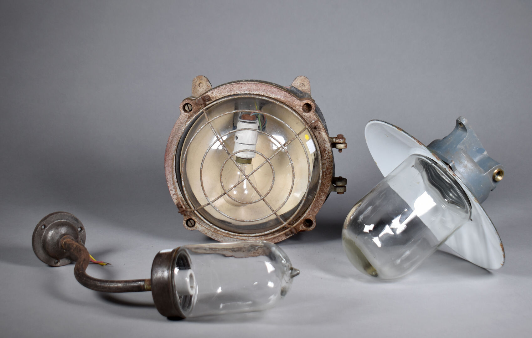 Lot n° 395 Adjugé : 80 € Ensemble de 3 lampes industrielles soit une applique… Estimation : 80 / 120 €