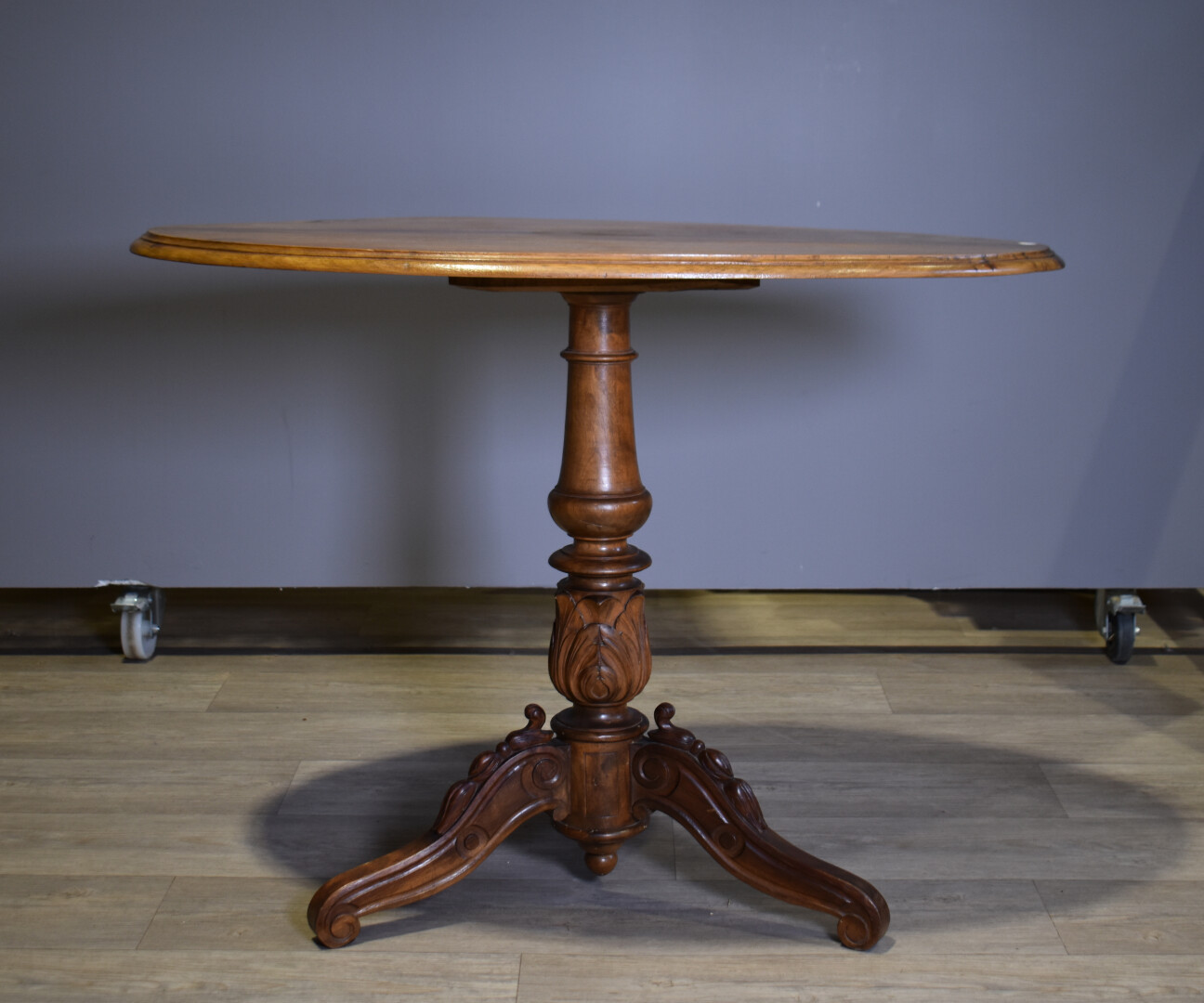 Lot n° 468 Adjugé : 30 € Guéridon en noyer mouluré et sculpté, plateau ovale,… Estimation : 40 / 80 €