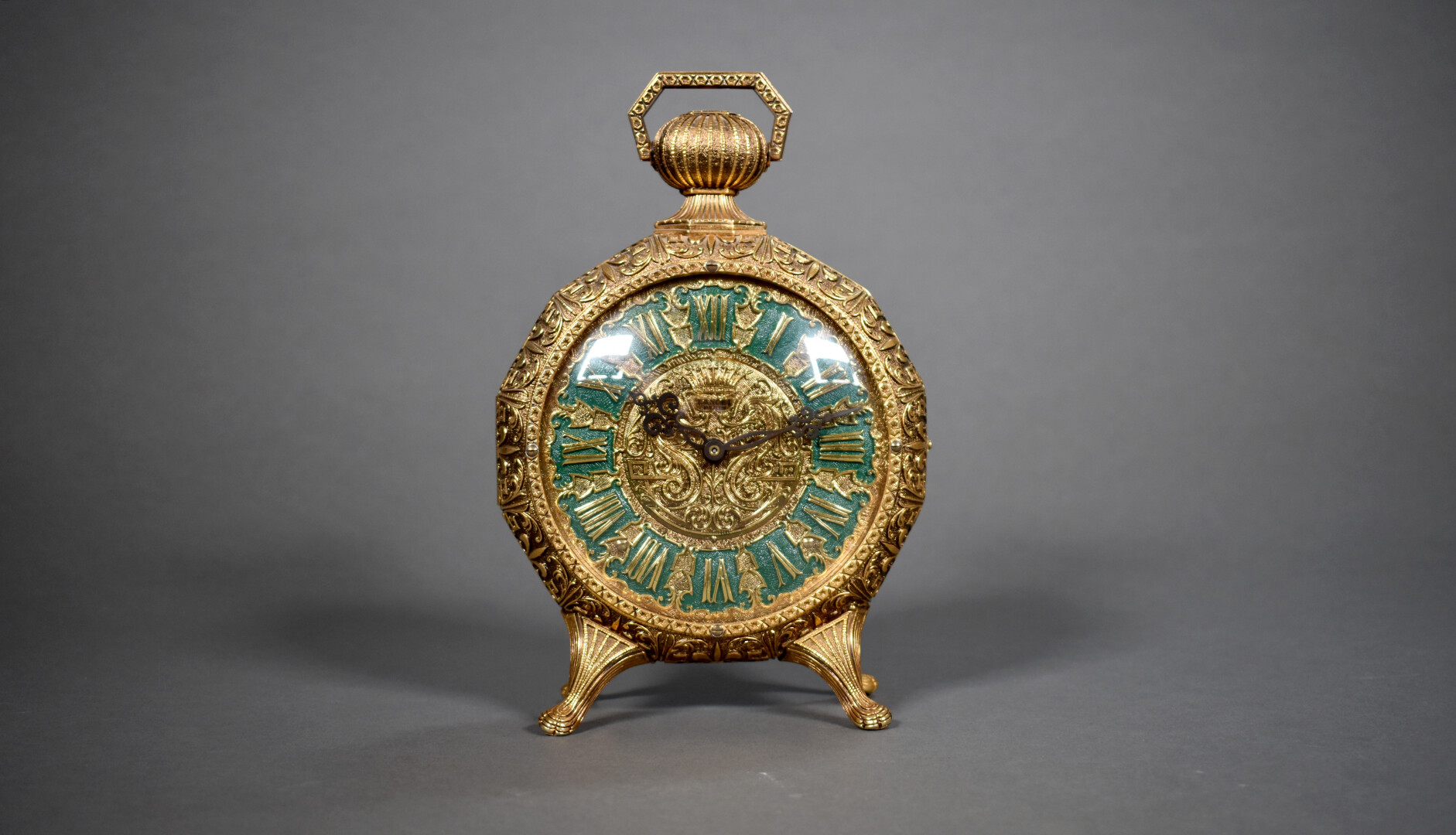 Lot n° 394 Adjugé : 50 € Pendulette en métal doré ciselé, cadran émaillé bleu… Estimation : 40 / 60 €