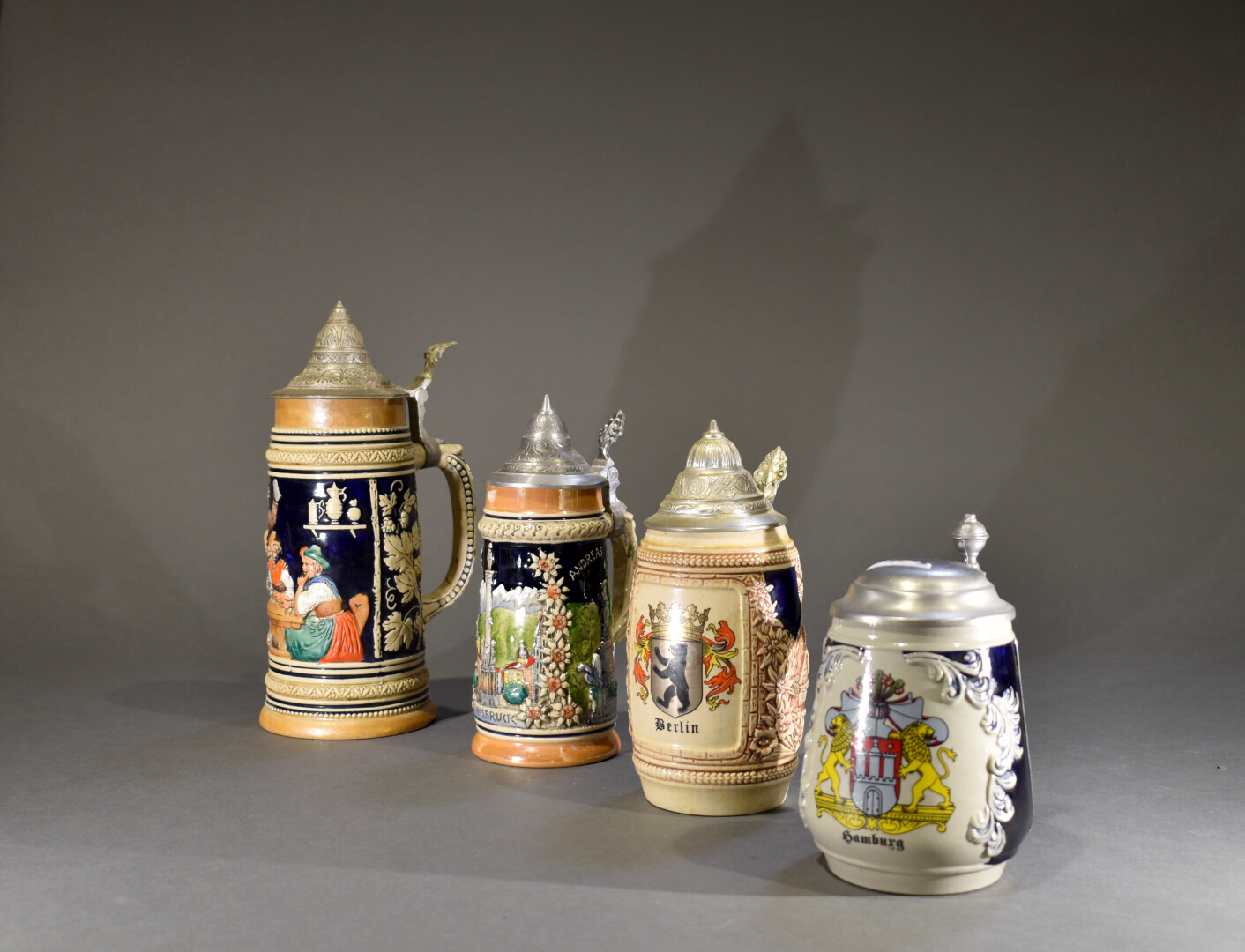 Lot n° 129 Adjugé : 20 € Collection de quatre chopes allemandes ou alsaciennes à… Estimation : 15 / 25 €