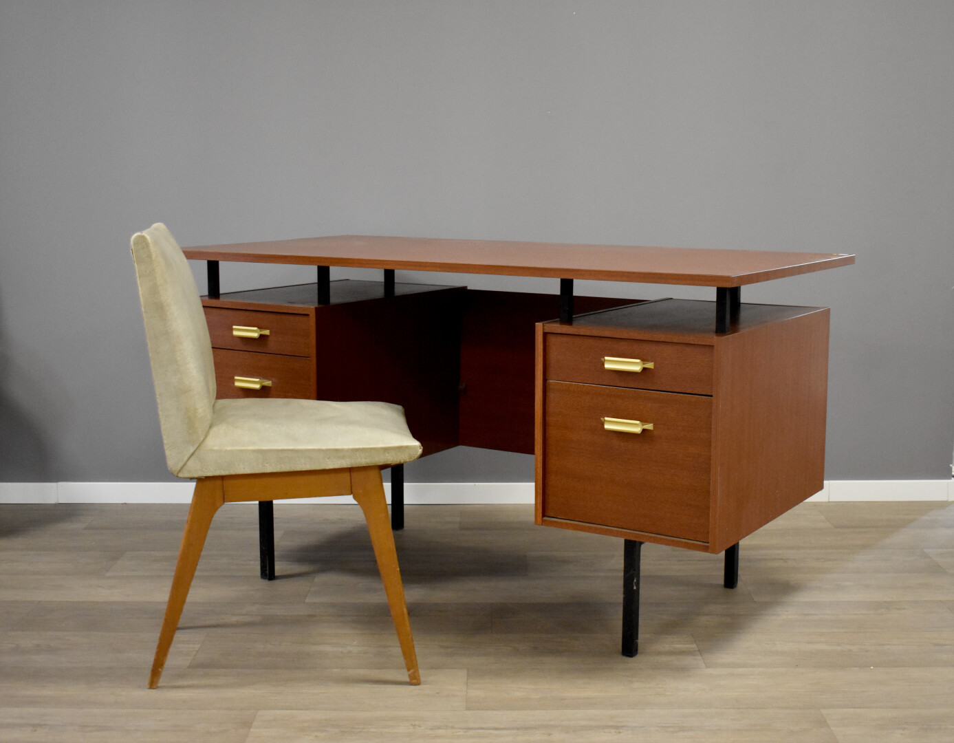 Lot n° 168 Adjugé : 110 € BUROFORM. Bureau à caissons en aggloméré façon acajou.… Estimation : 100 / 150 €