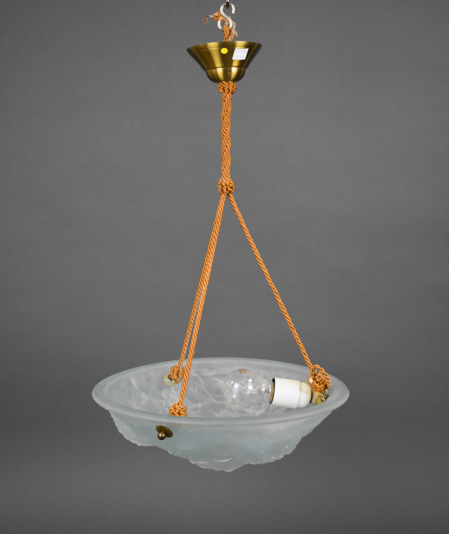 Lot n° 170 Adjugé : 20 € Suspension à vasque en verre moulé légèrement bleuté… Estimation : 30 / 50 €