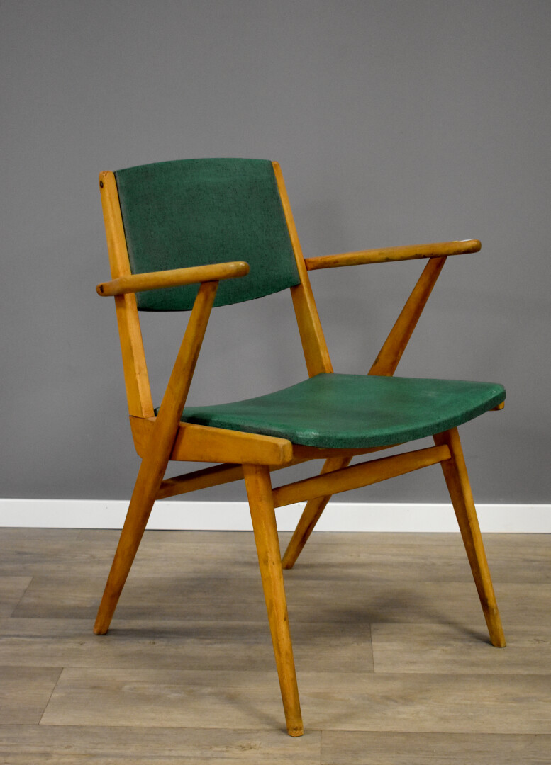 Lot n° 88 Adjugé : 81 € Fauteuil en hêtre (mouillures, insolé) garniture de skaï… Estimation : 40 / 60 €