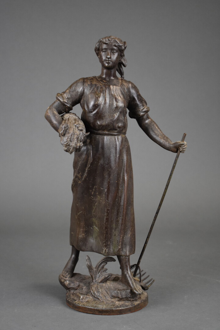 Lot n° 163 Adjugé : 30 € Faneuse en régule patiné brun représentant une fermière… Estimation : 30 / 40 €