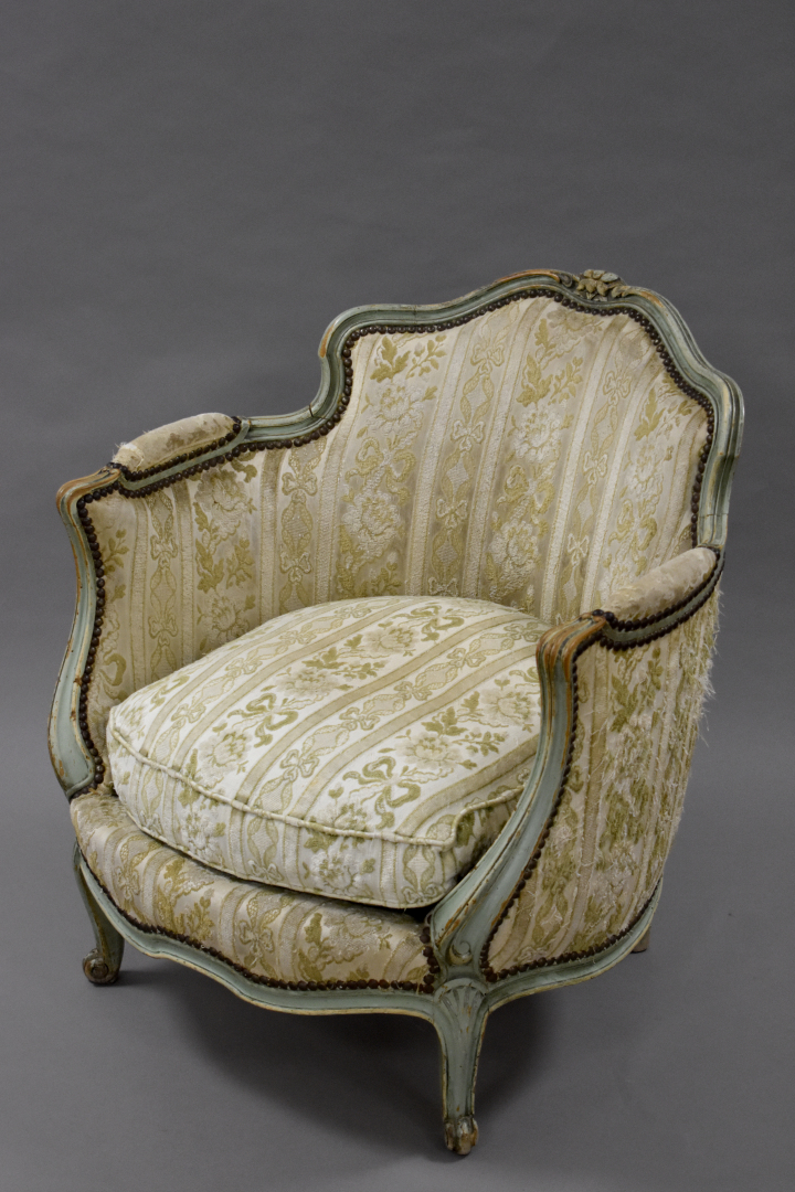 Lot n° 293 Adjugé : 130 € Petite chauffeuse en bois mouluré laqué vert céladon.… Estimation : 60 / 80 €