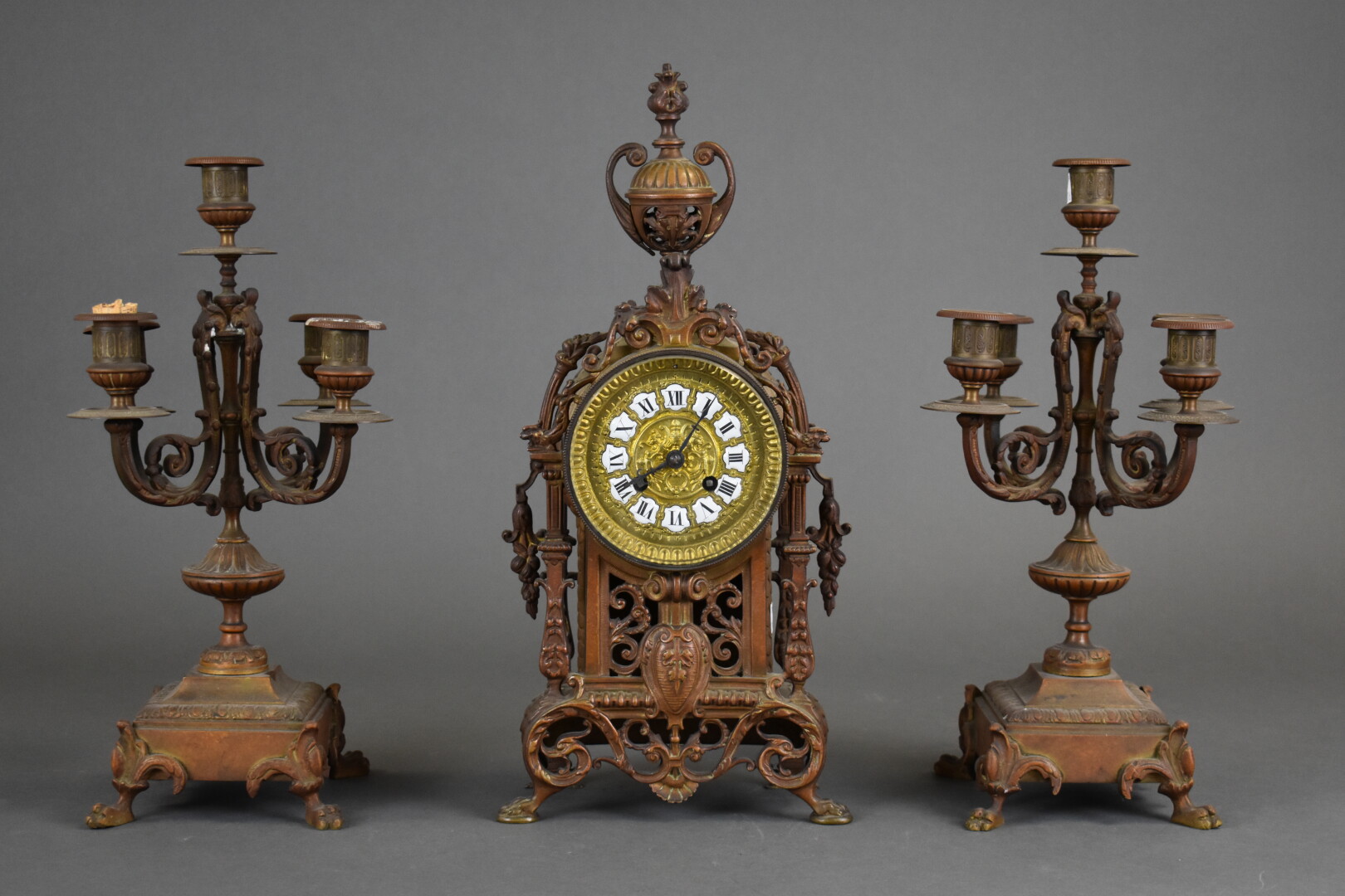 Lot n° 298 Adjugé : 70 € Garniture de cheminée en bronze comprenant une pendule… Estimation : 30 / 60 €