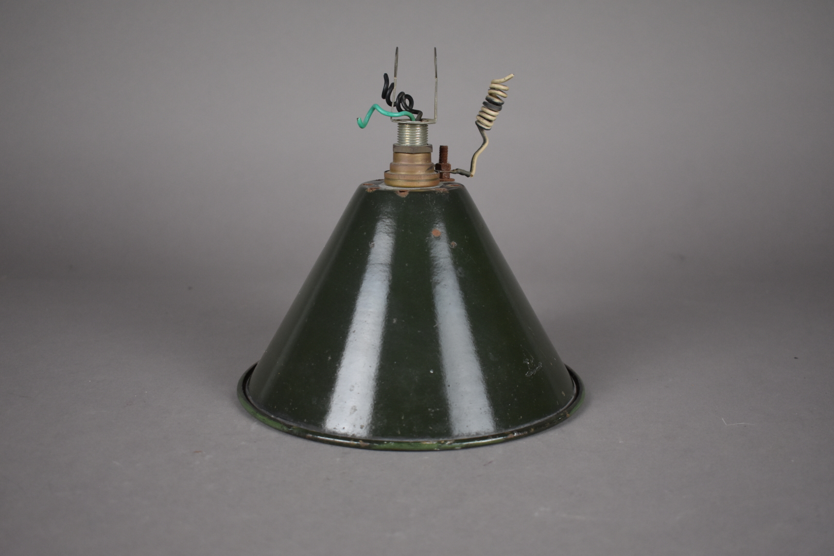 Lot n° 184 Adjugé : 15 € Suspension conique en tôle émaillée vert kaki. Milieu… Estimation : 20 / 25 €