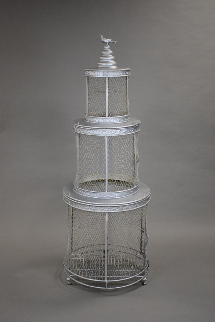Lot n° 186 Adjugé : 40 € Grande cage en tole grillagée (repeinte argenté). XXe… Estimation : 40 / 60 €