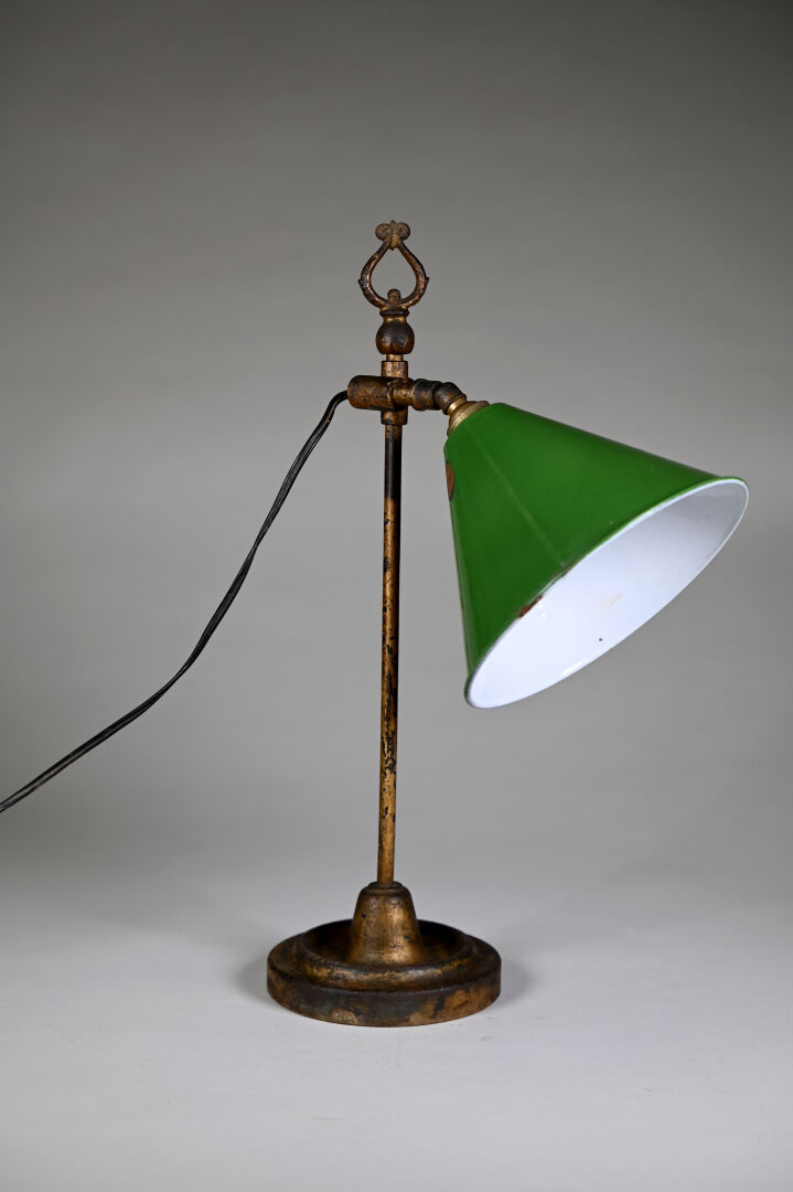 Lot n° 165 Adjugé : 50 € Lampe de bijoutier en métal anciennement doré. L’abat-jour… Estimation : 30 / 60 €