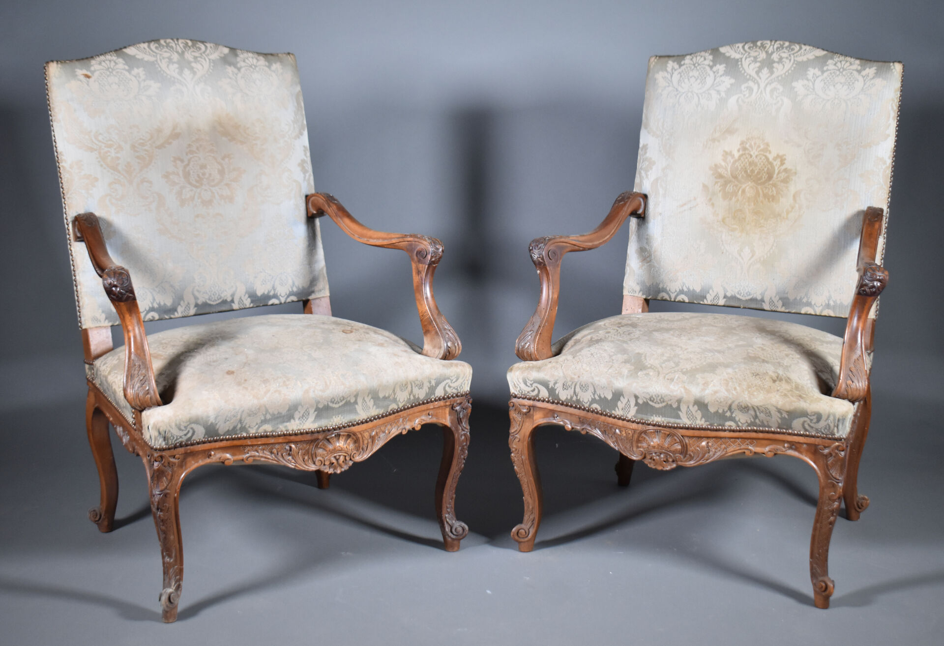 Lot n° 154 Adjugé : 140 € Paire de larges fauteuils en noyer mouluré sculpté,… Estimation : 80 / 120 €