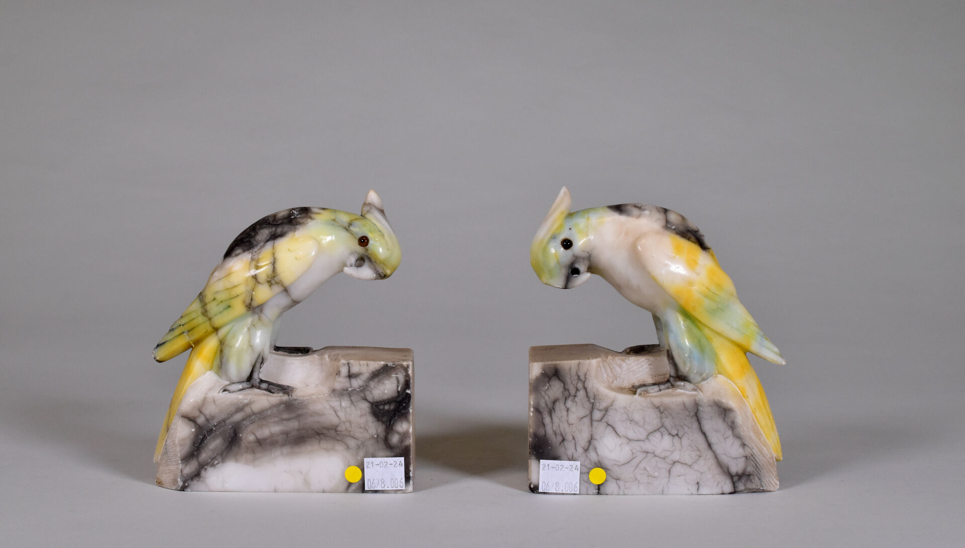 Lot n° 285 Adjugé : 30 € Paire de serre-livres en albâtre peint représentant des… Estimation : 20 / 40 €