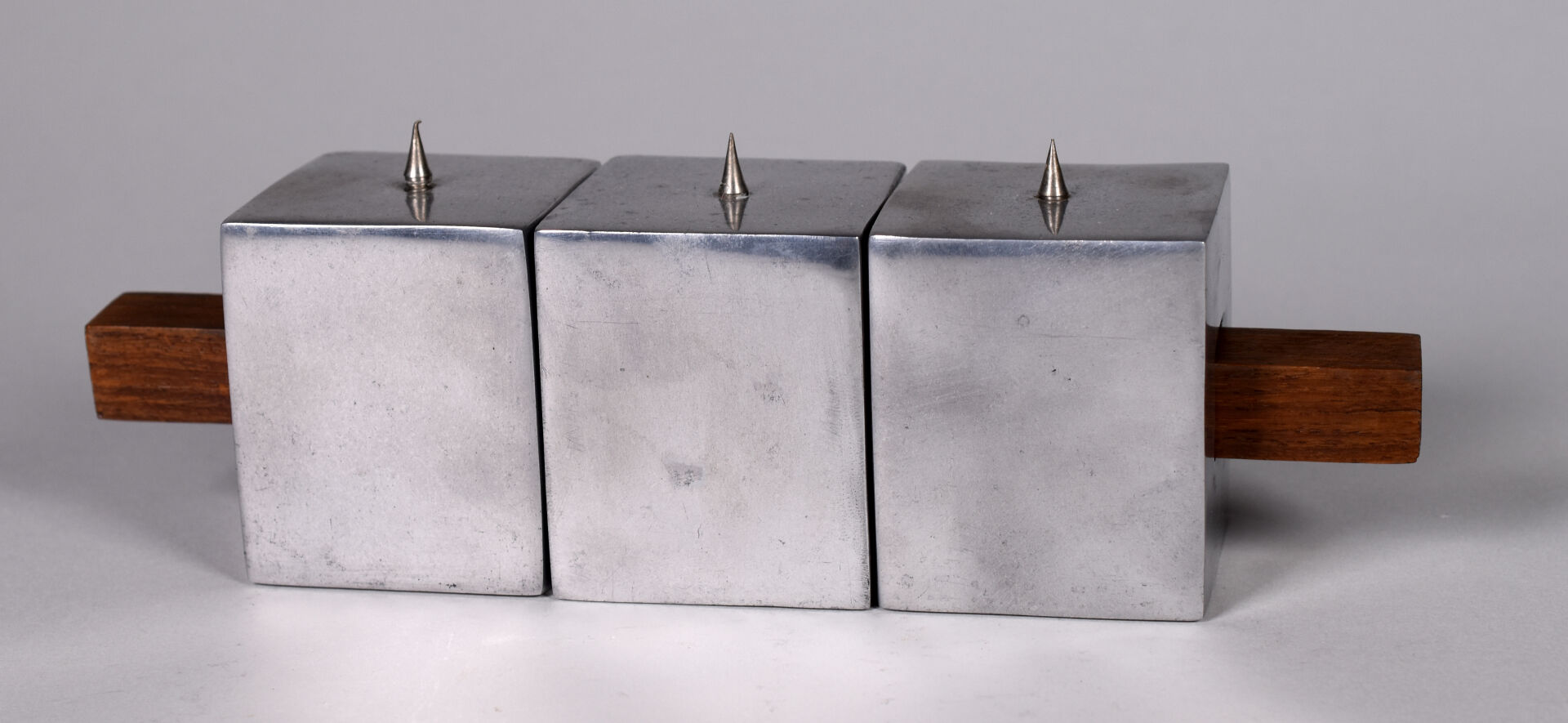 Lot n° 306 Adjugé : 60 € 3 pique-cierges cubiques en métal, coulissants sur une… Estimation : 60 / 80 €
