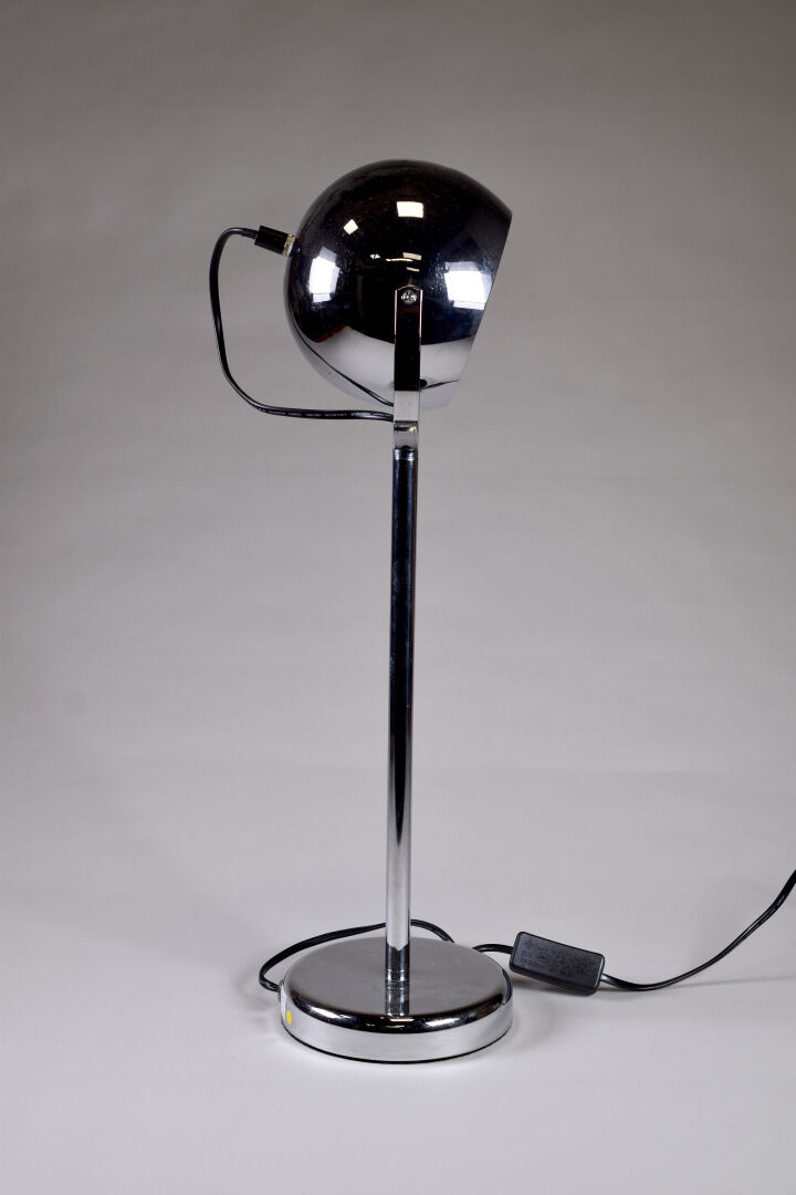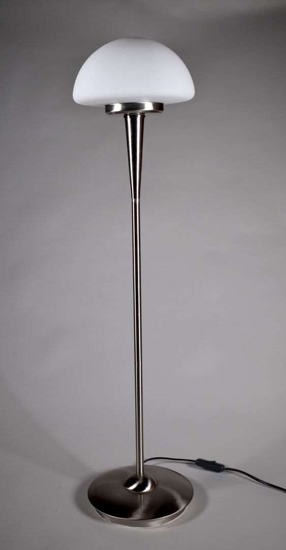 Lot n° 288 Adjugé : 90 € Lampe champignon en métal brossé à opaline blanche.… Estimation : 80 / 100 €