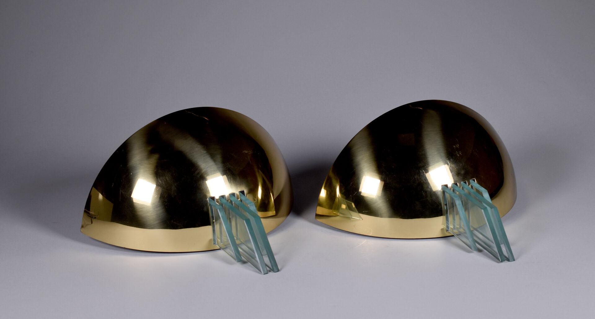 Lot n° 290 Adjugé : 120 € MASSIVE. Paire d’appliques demi-vasque en métal doré et… Estimation : 60 / 80 €