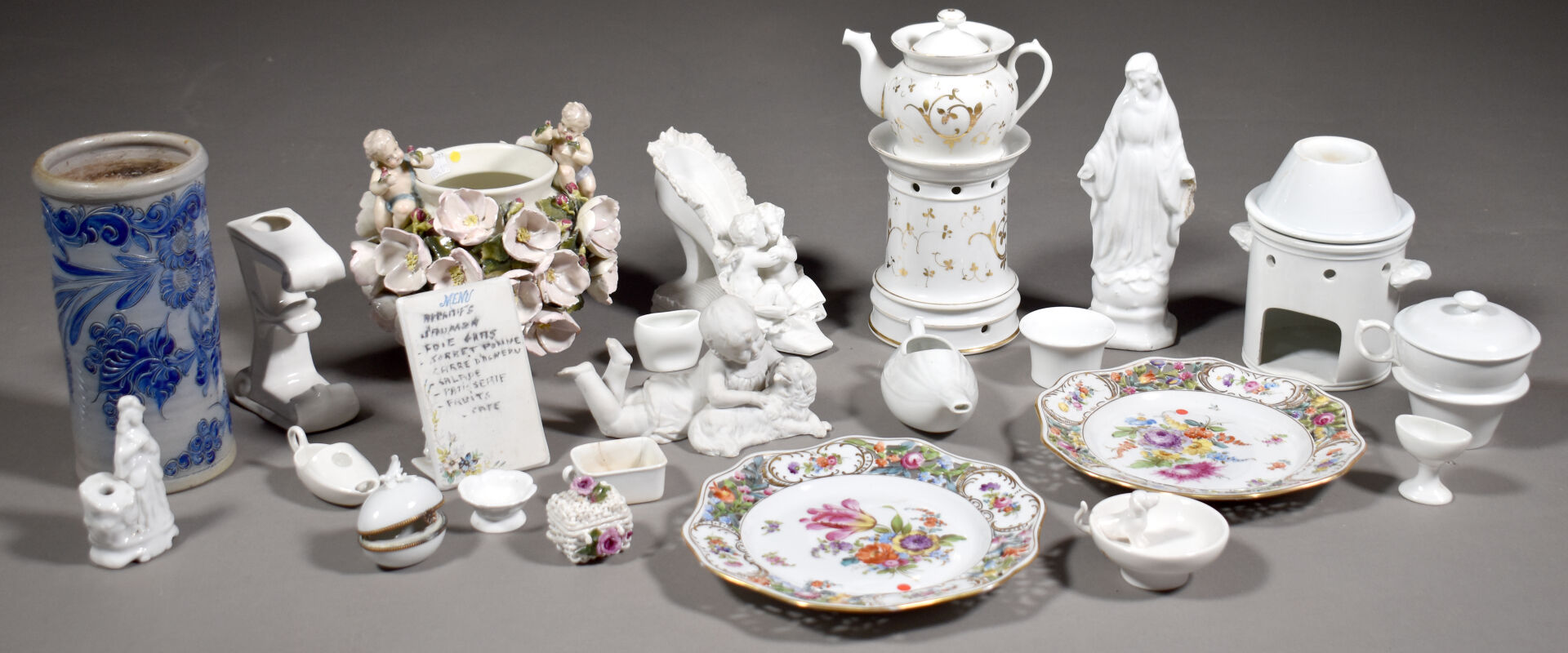 Lot n° 237 Adjugé : 40 € Ensemble en porcelaine, biscuit et grès dont samovar… Estimation : 40 / 60 €