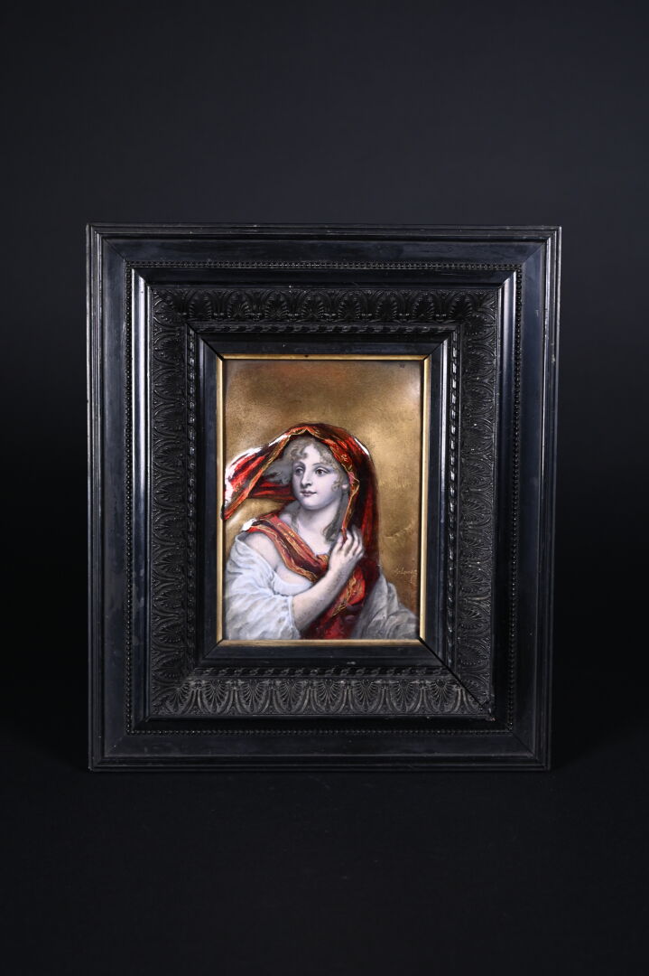 Lot n° 227 Charlotte LOUVET (1837-1921). Plaque émaillée représentant une femme… Estimation : 200 / 300 €