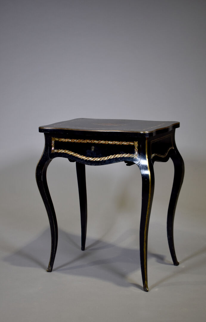 Lot n° 187 Adjugé : 120 € Table travailleuse en bois noirci (accidents) marqueté d’un… Estimation : 100 / 150 €