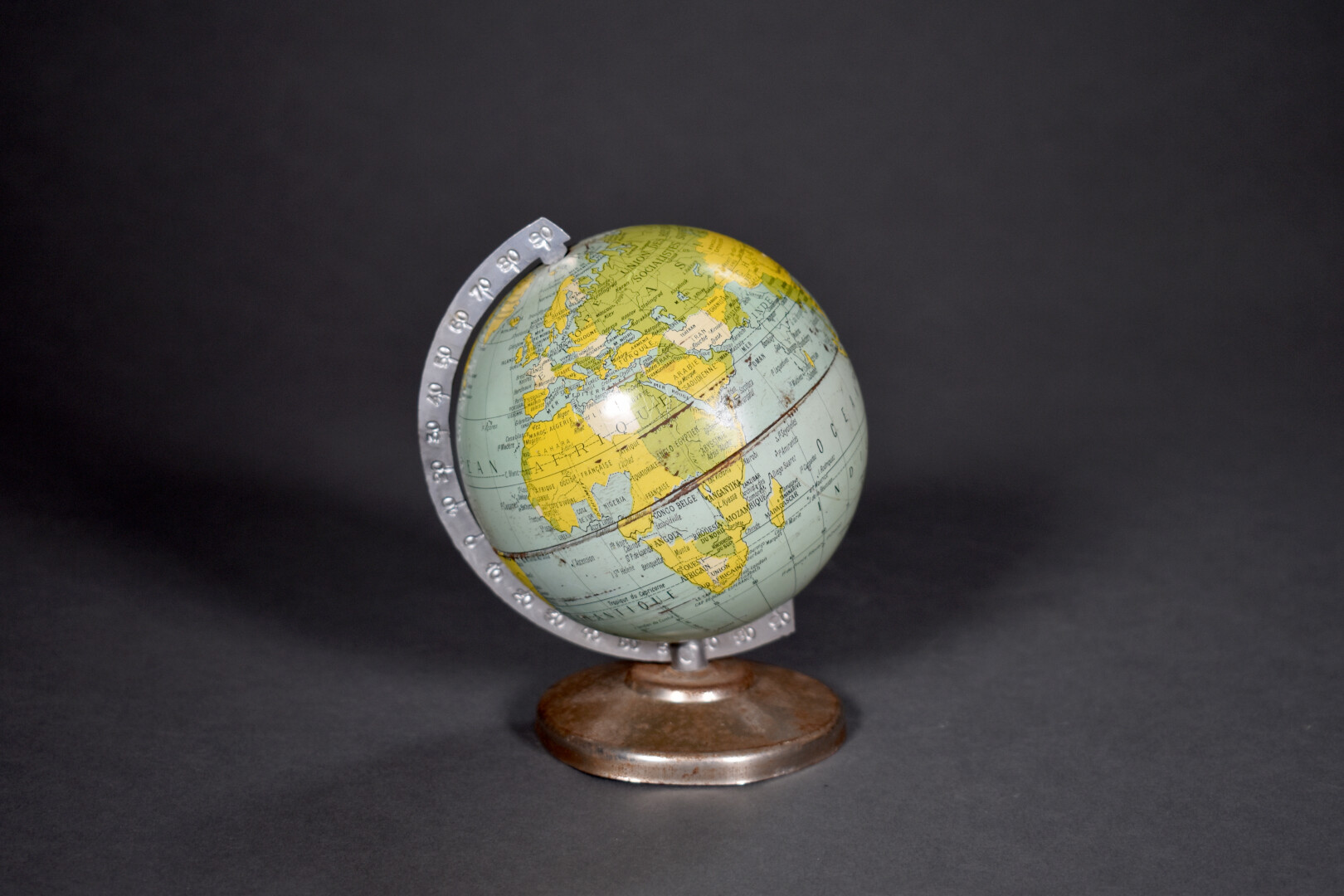 Lot n° 447 Adjugé : 30 € Globe miniature en tôle lithographiée. Socle et base… Estimation : 10 / 20 €