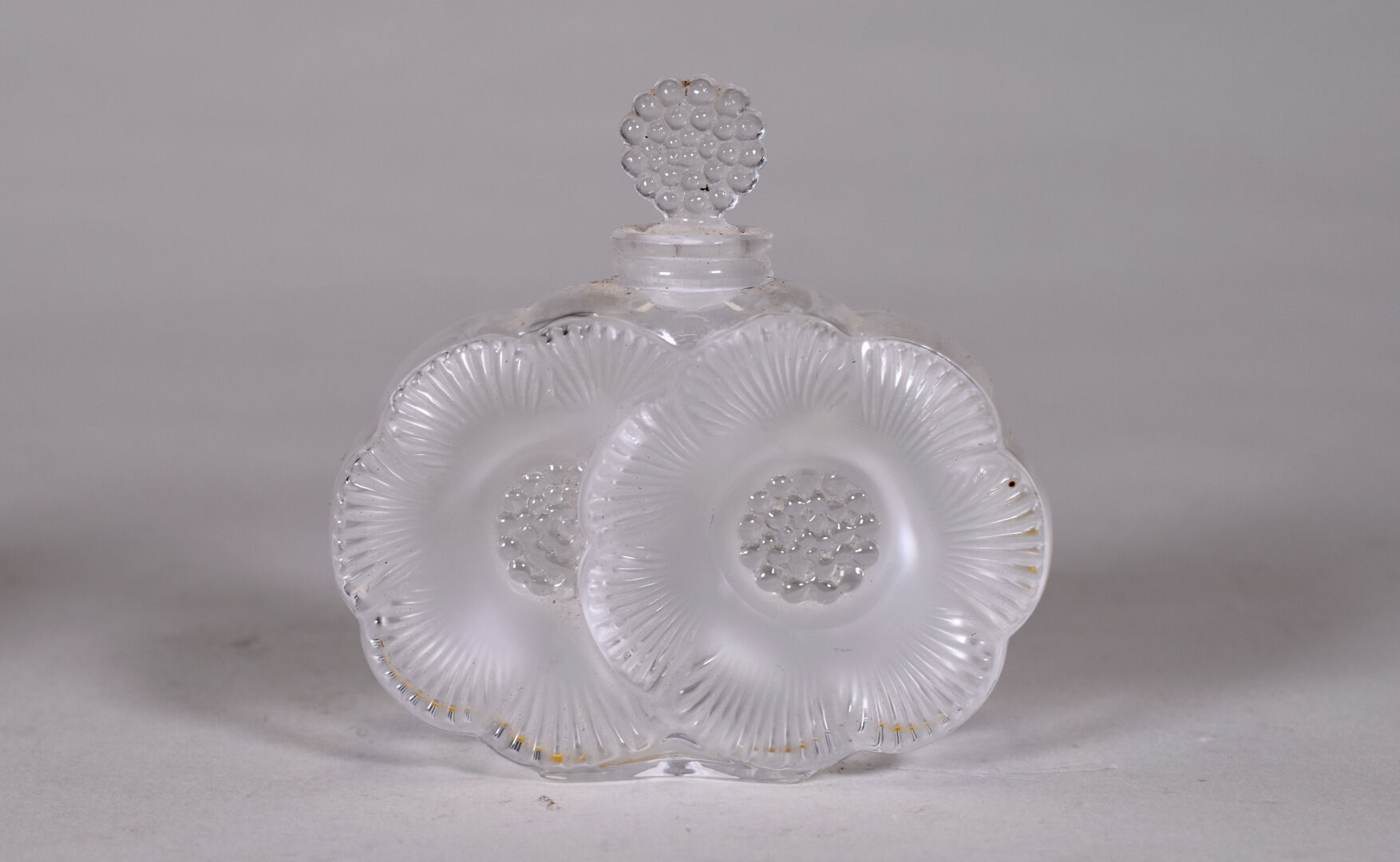 Lot n° 113 Adjugé : 60 € LALIQUE France. Flacon et bouchon modèle « Anémones », en… Estimation : 60 / 80 €