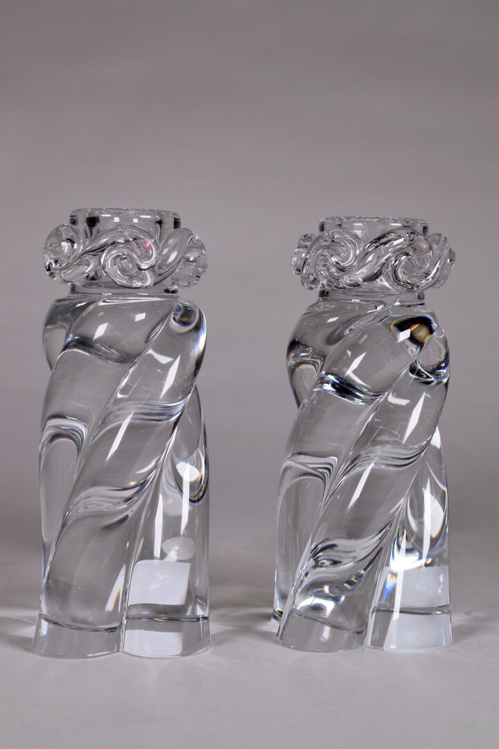 Lot n° 107 Adjugé : 80 € BACCARAT. Paire de bougeoirs à fût godronné torsadé.… Estimation : 40 / 50 €