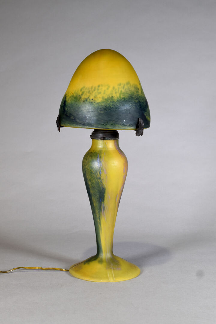 Lot n° 324 Adjugé : 220 € LE VERRE FRANCAIS. Lampe champignon en verre marmoréen… Estimation : 120 / 180 €